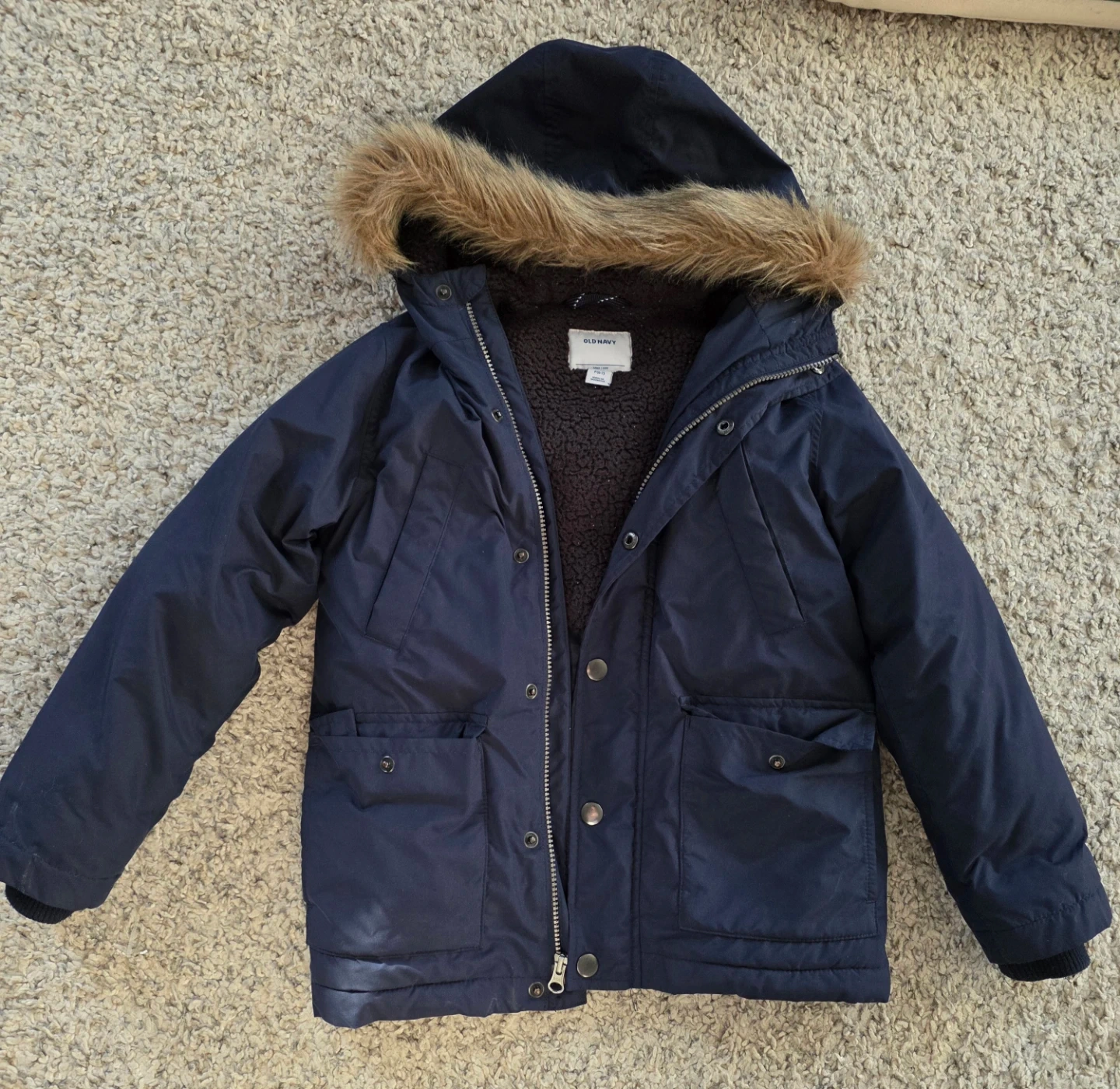 A warm and cozy winter jacket from Old Navy for kids, size 7! It's in great condition and perfect for keeping your little one snug during the colder months. Features a faux fur-trimmed hood and a soft lining