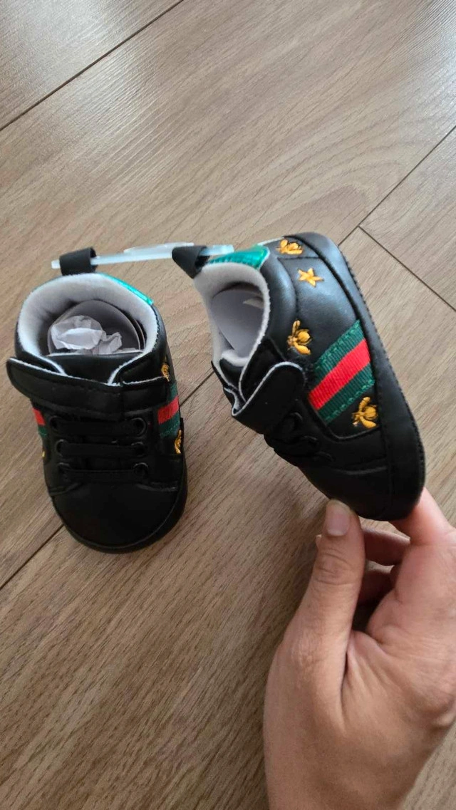 Dress your little one in style with these adorable baby shoes. These shoes feature the classic stripe and embroidered bees, adding a touch of luxury to your baby's outfit. These shoes are new. * Colour: Black * Size: Baby If the ad is live, the item is available!