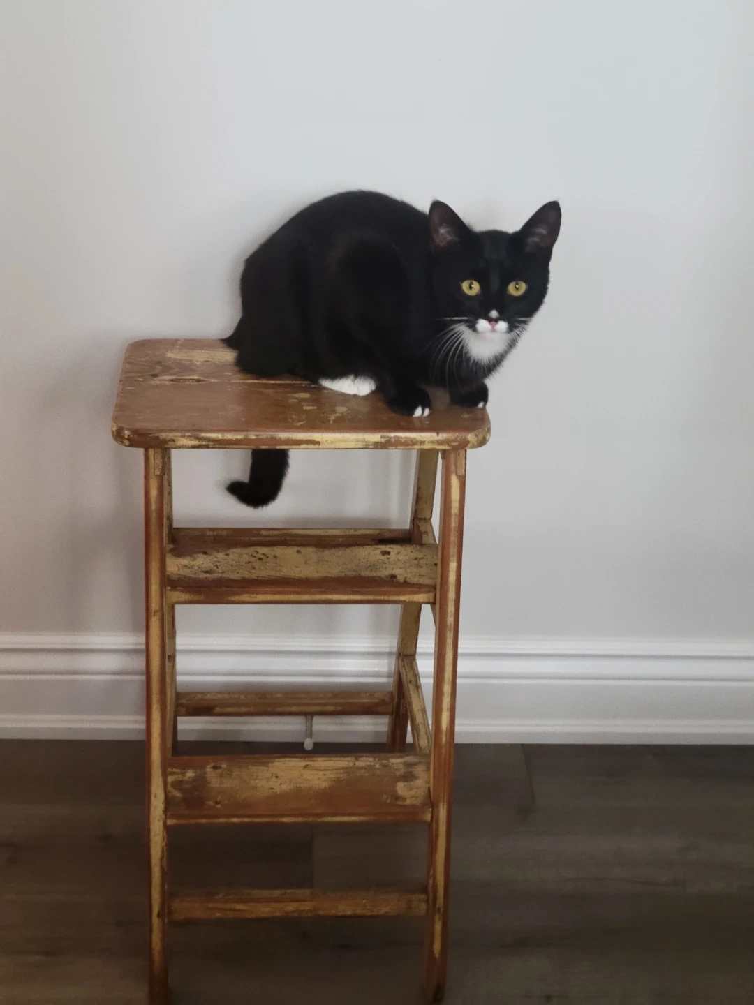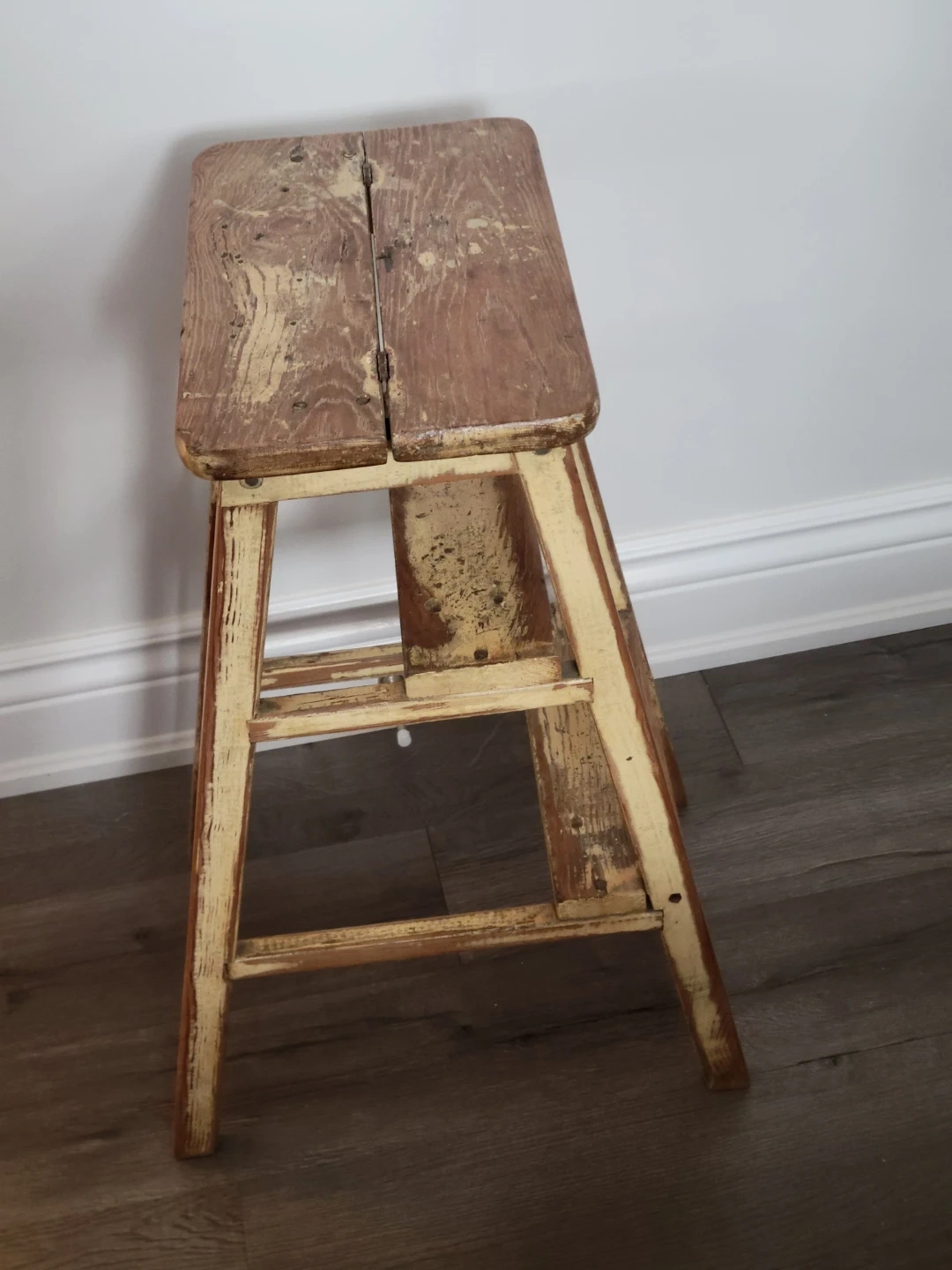 This vintage wooden step stool is a unique find. It's got a rustic look with a weathered finish, perfect for adding a touch of character to any room.