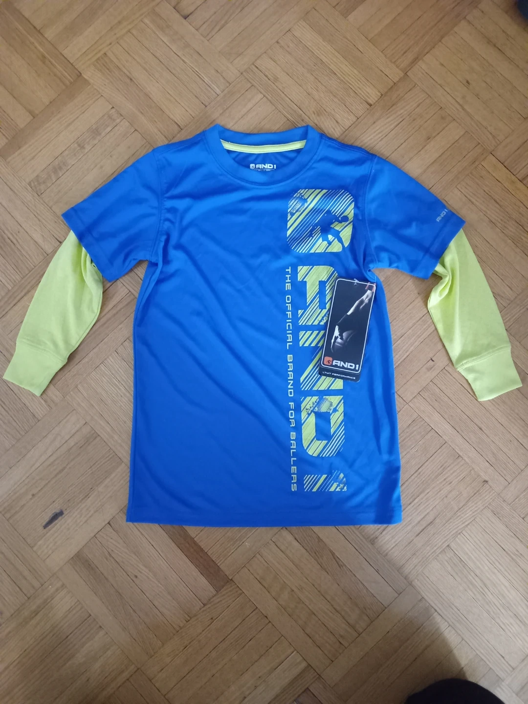 This AND1 basketball t-shirt is perfect for your little baller! It's brand new with tags, size XS (4/5). The shirt is blue with yellow accents and features the AND1 logo. It's made of lightweight performance material, great for playing basketball or just hanging out