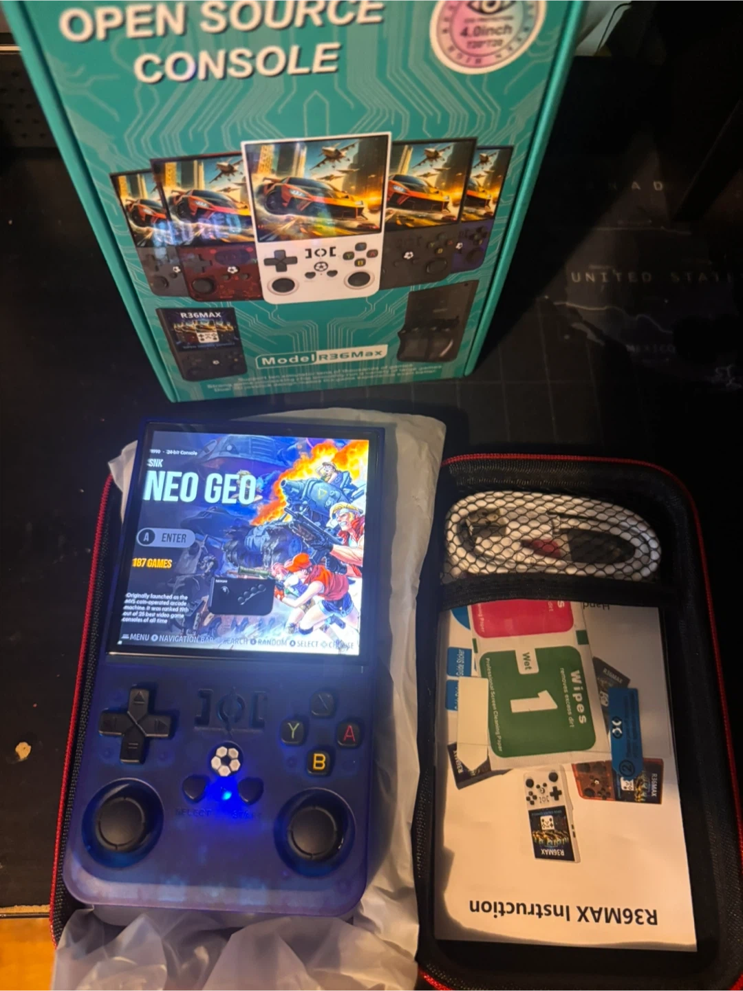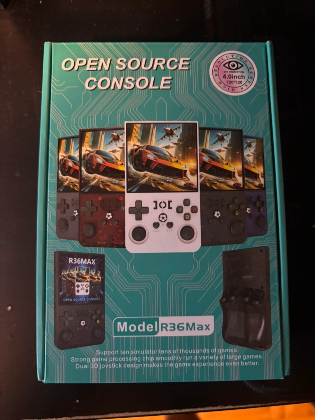 Selling 2 R36 Max open source console handheld game system! It supports ten simulators and thousands of games. The strong game processing chip smoothly runs a variety of large games. The dual 3D joystick design makes the game experience even better. Included is the charger and instruction manual, and it all comes in the original box