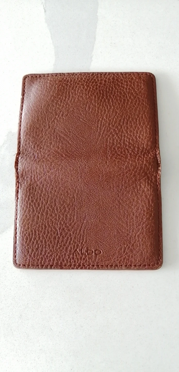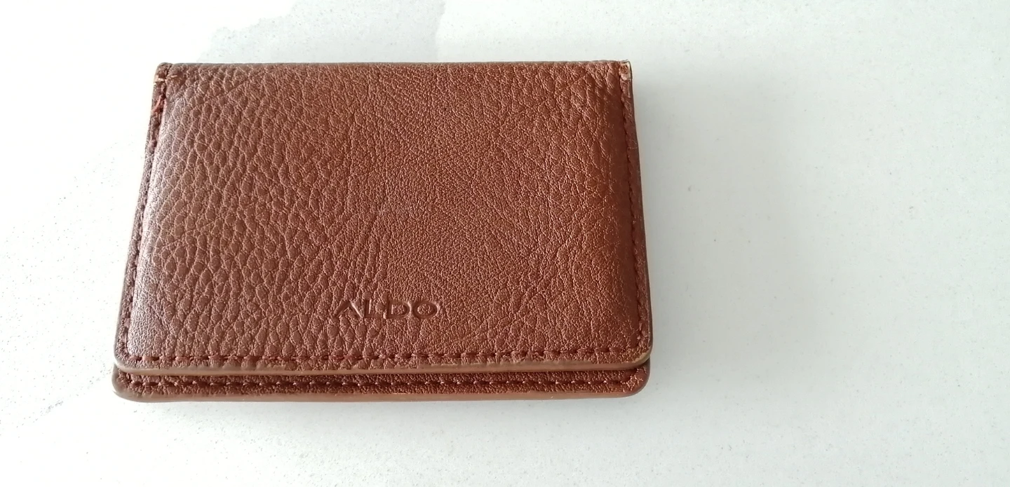 This is a brown leather cardholder from Aldo. It's perfect for keeping your cards organized and easily accessible. The cardholder is in good condition, some wear on the corners and has a stylish, textured leather finish. Great for everyday use!