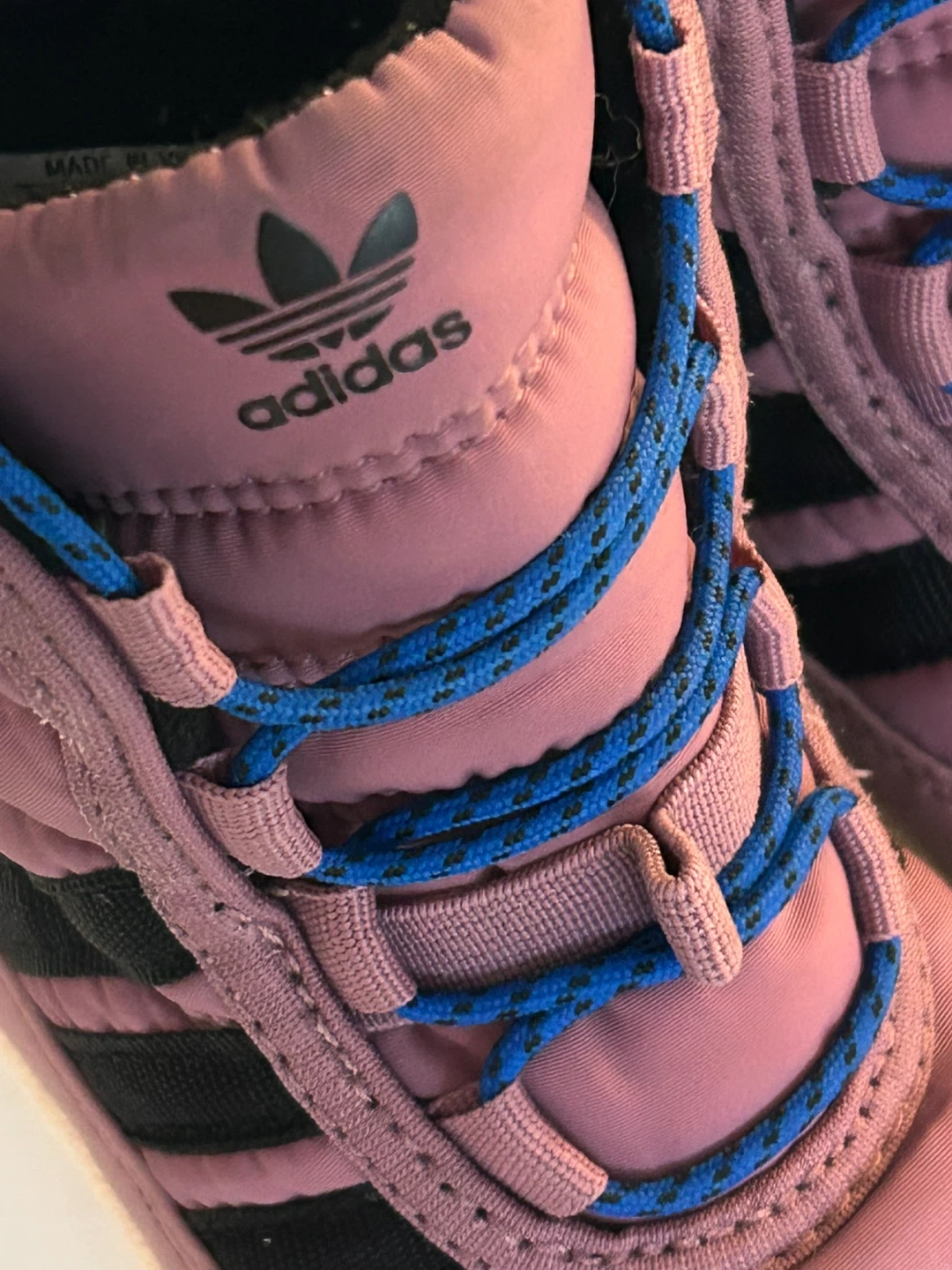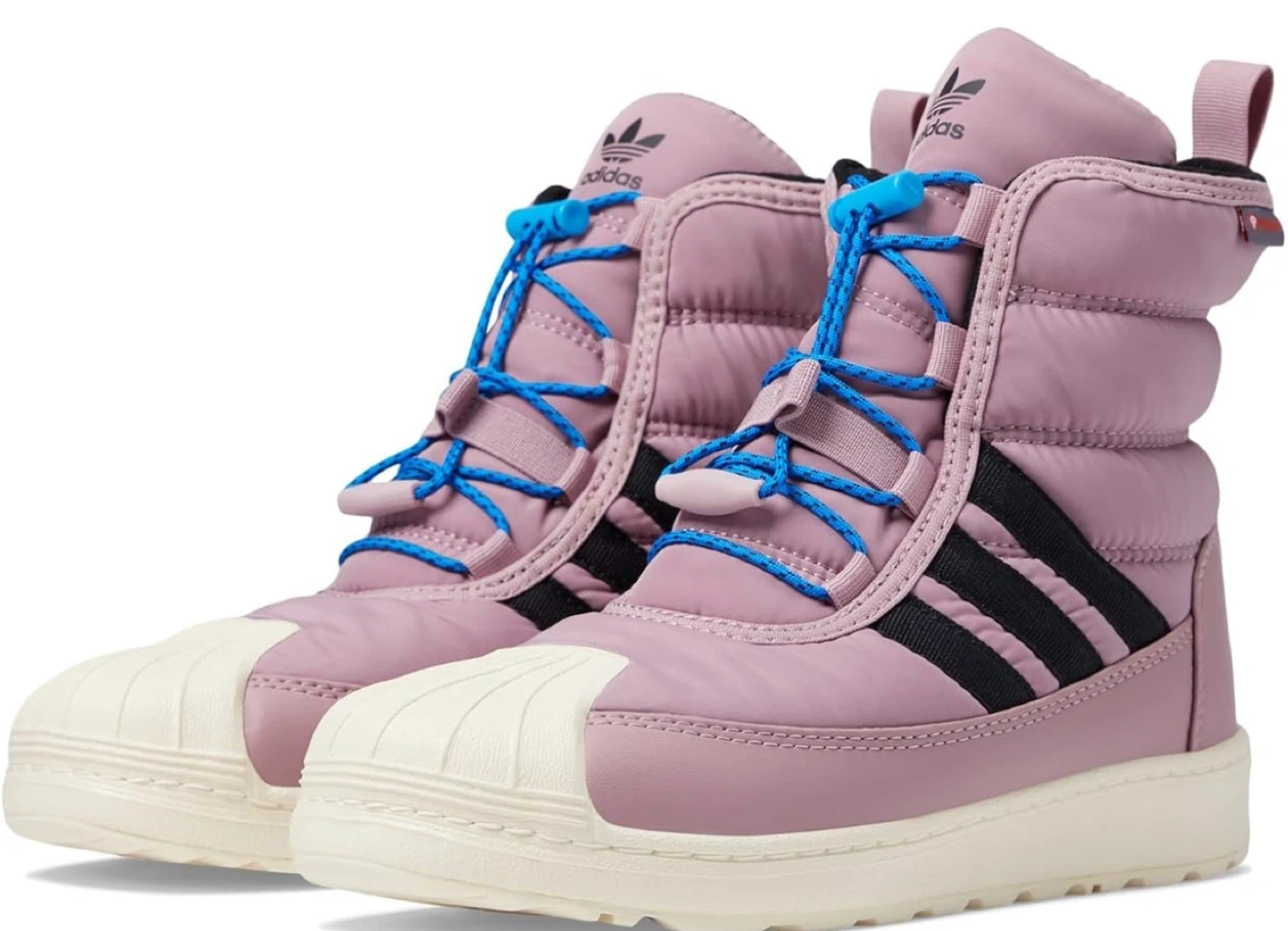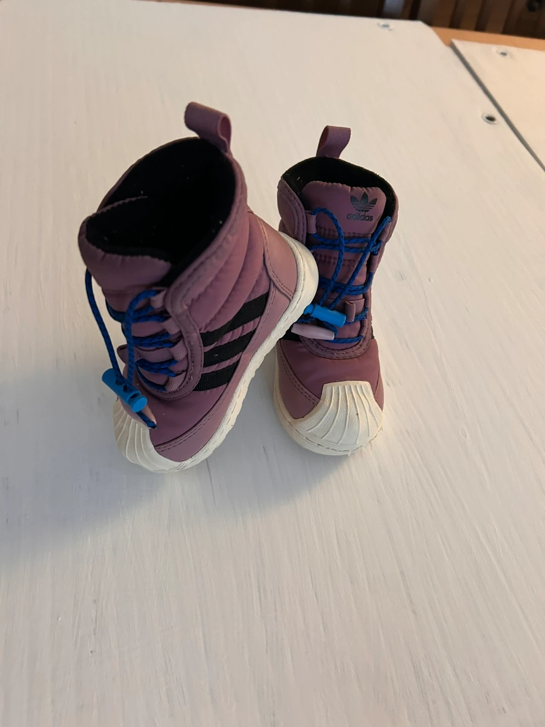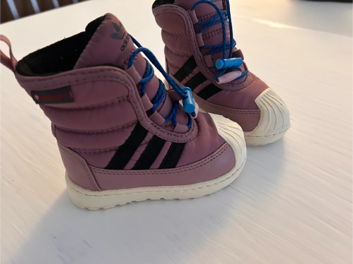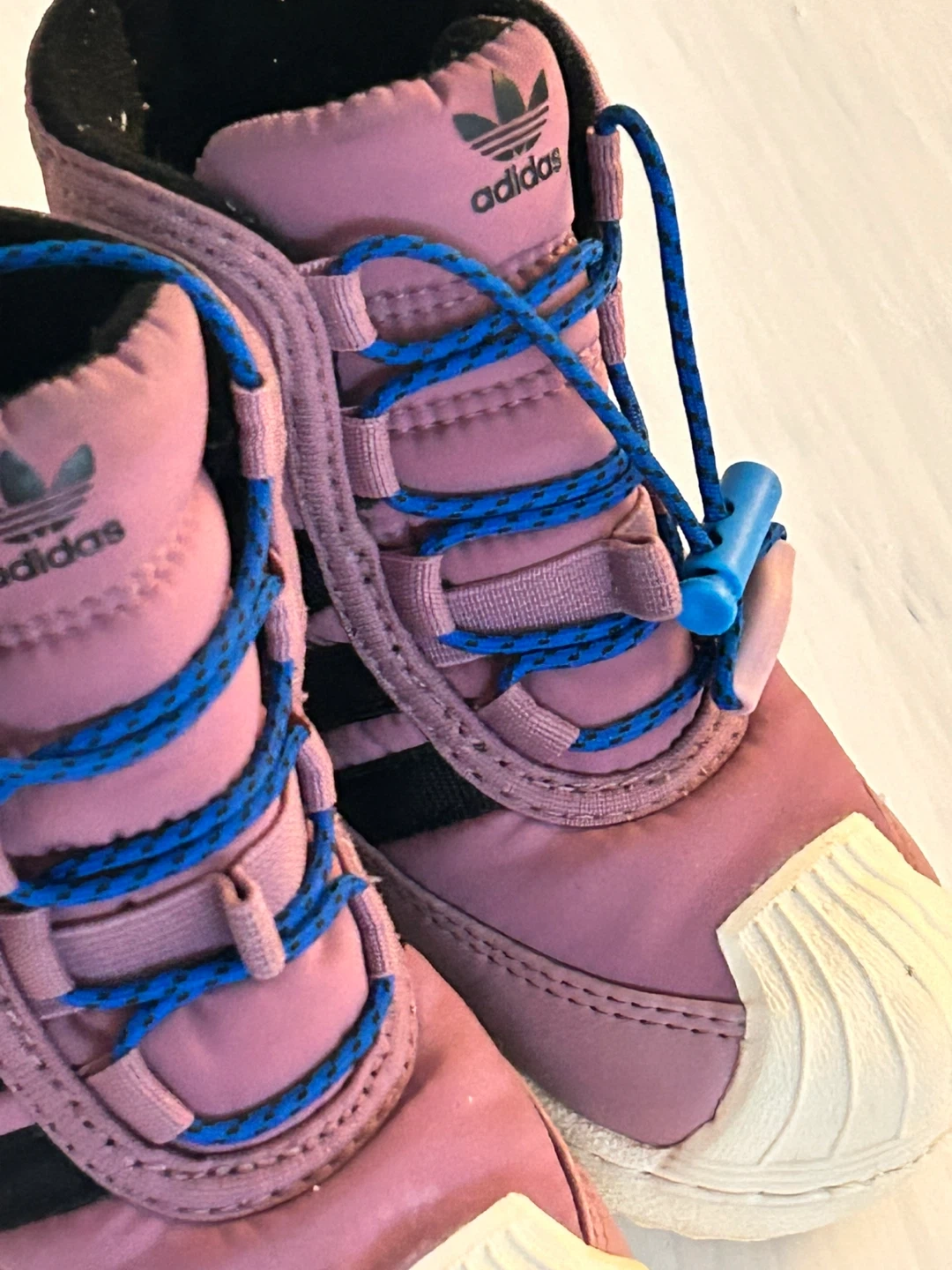 Check out these adorable Adidas Superstar 360 winter boots! They feature a stylish lilac colour with the classic Adidas three-stripe design in black. Perfect for keeping little feet warm and dry during the colder months! Size is unknown.