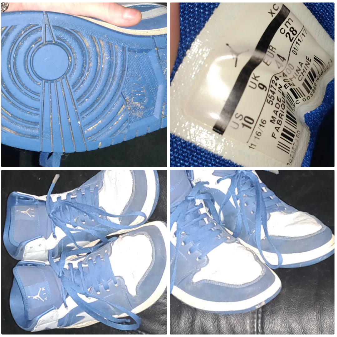 Selling a pair of Jordan 1 High sneakers in royal blue and white. They are size US 10. There are some signs of wear, as seen in the photos, but they still have lots of life left!
