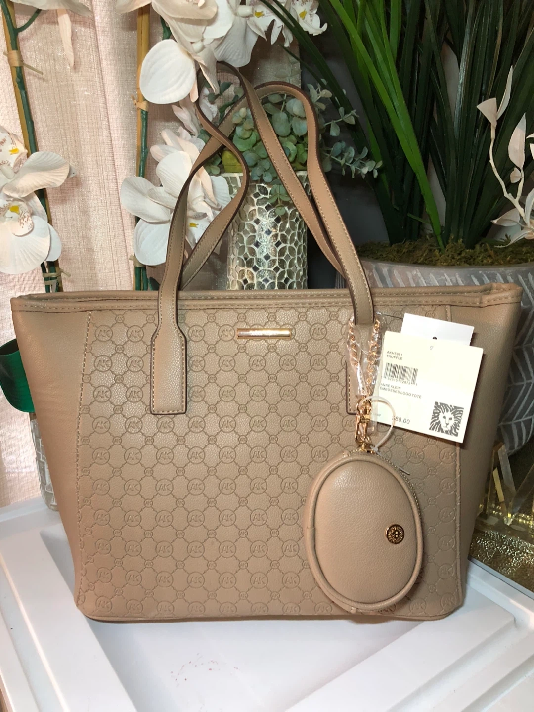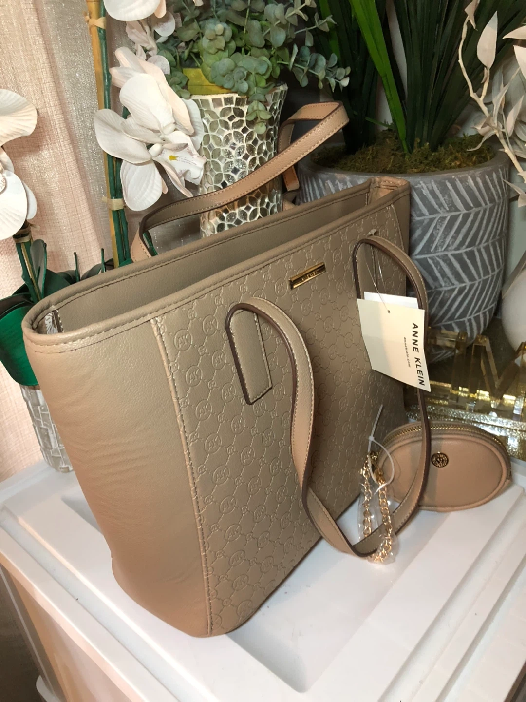 This is an Anne Klein embossed logo tote. It's a beautiful beige color and includes a matching coin purse! The original price was $88.00