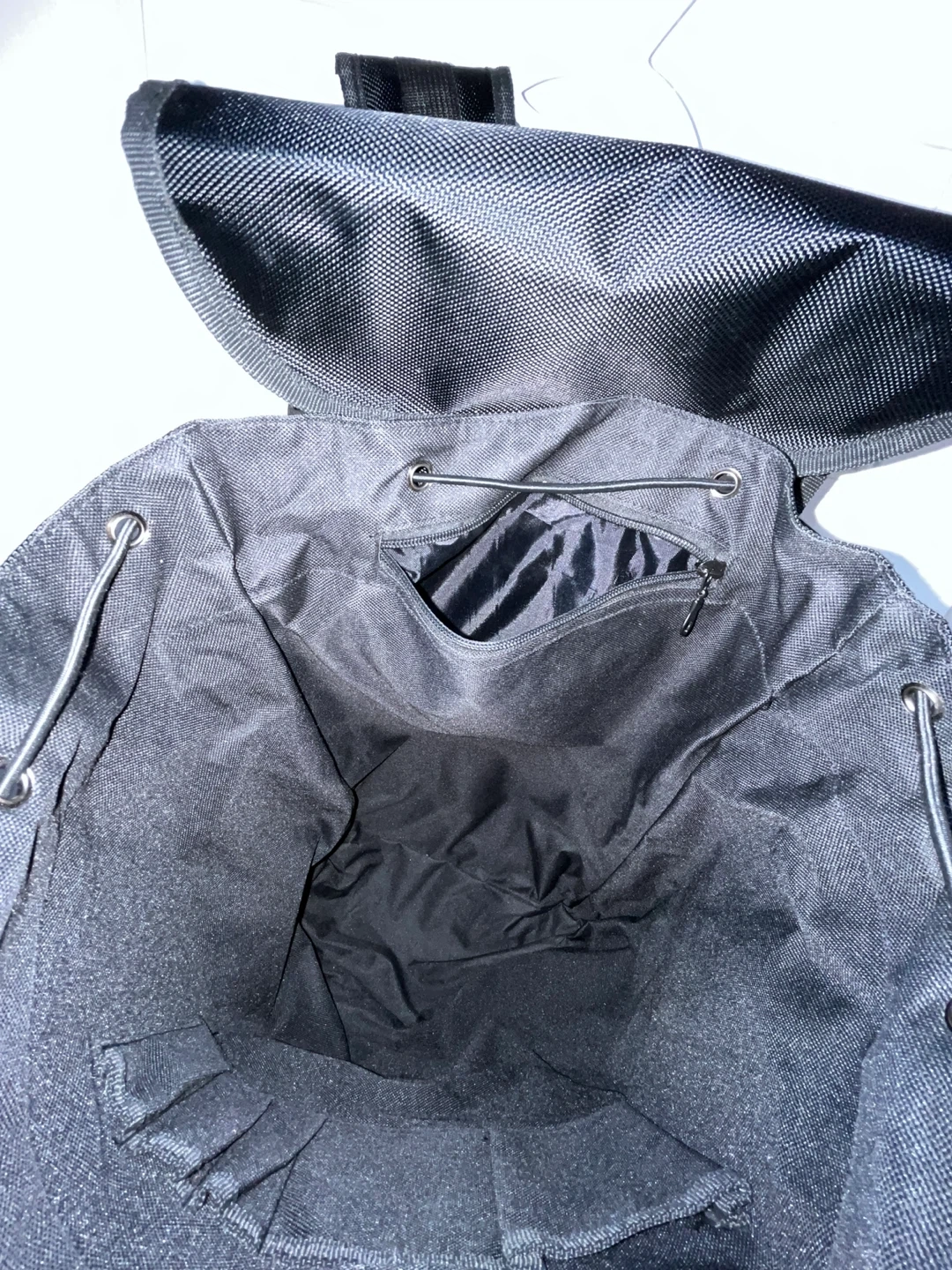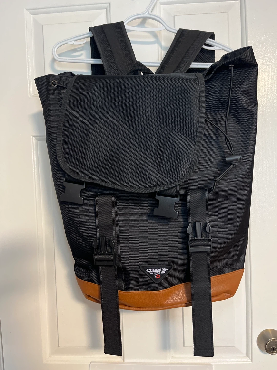 49This black Comback Pack backpack is in great shape and ready for a new home! It features a drawstring closure with a flap and buckle, plus adjustable straps for a comfy fit. The bottom is a stylish brown leather-like material.