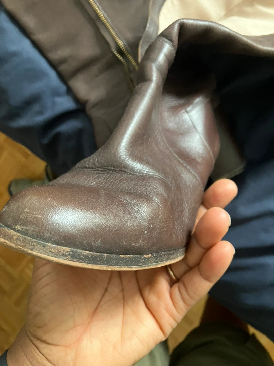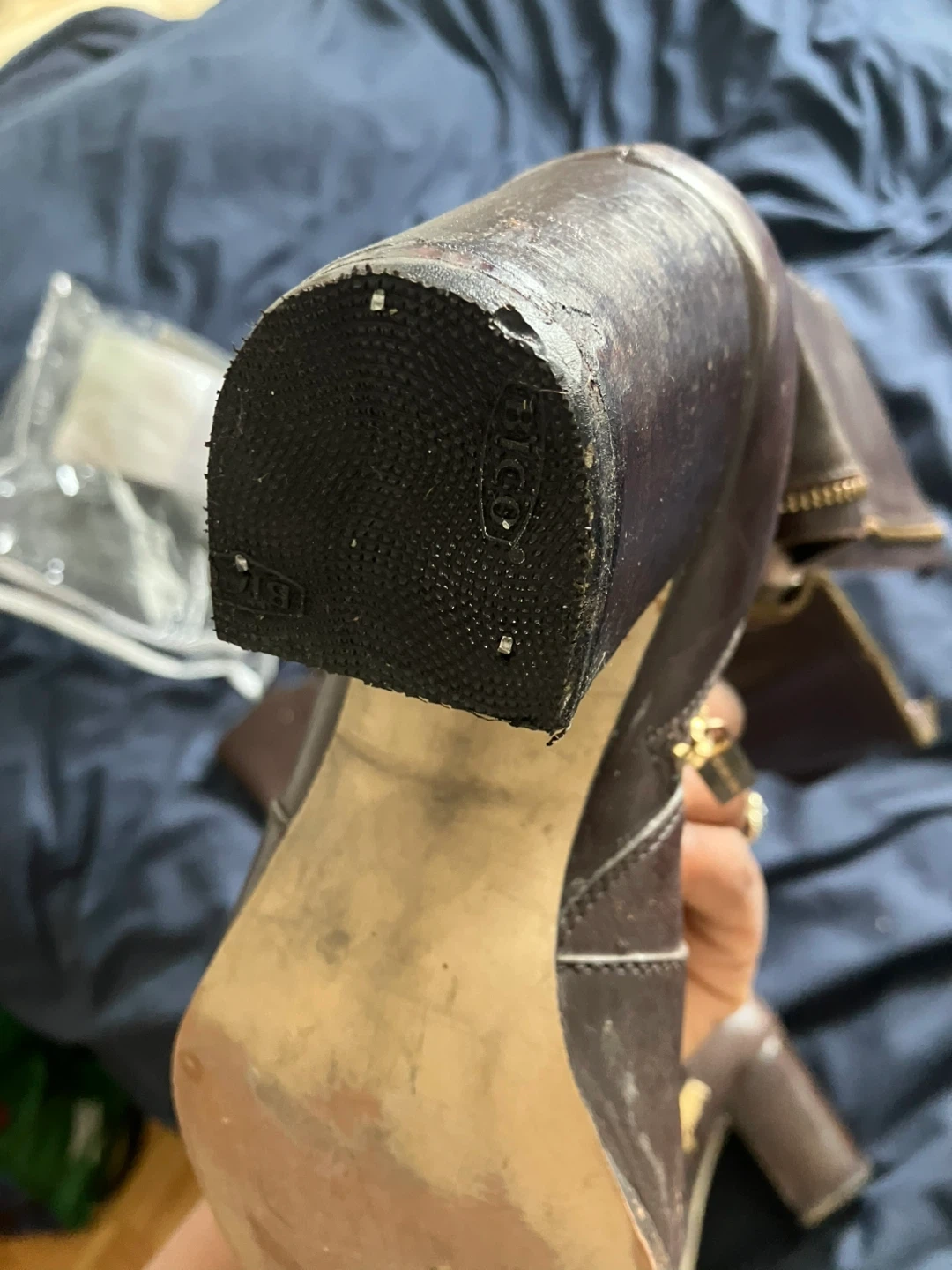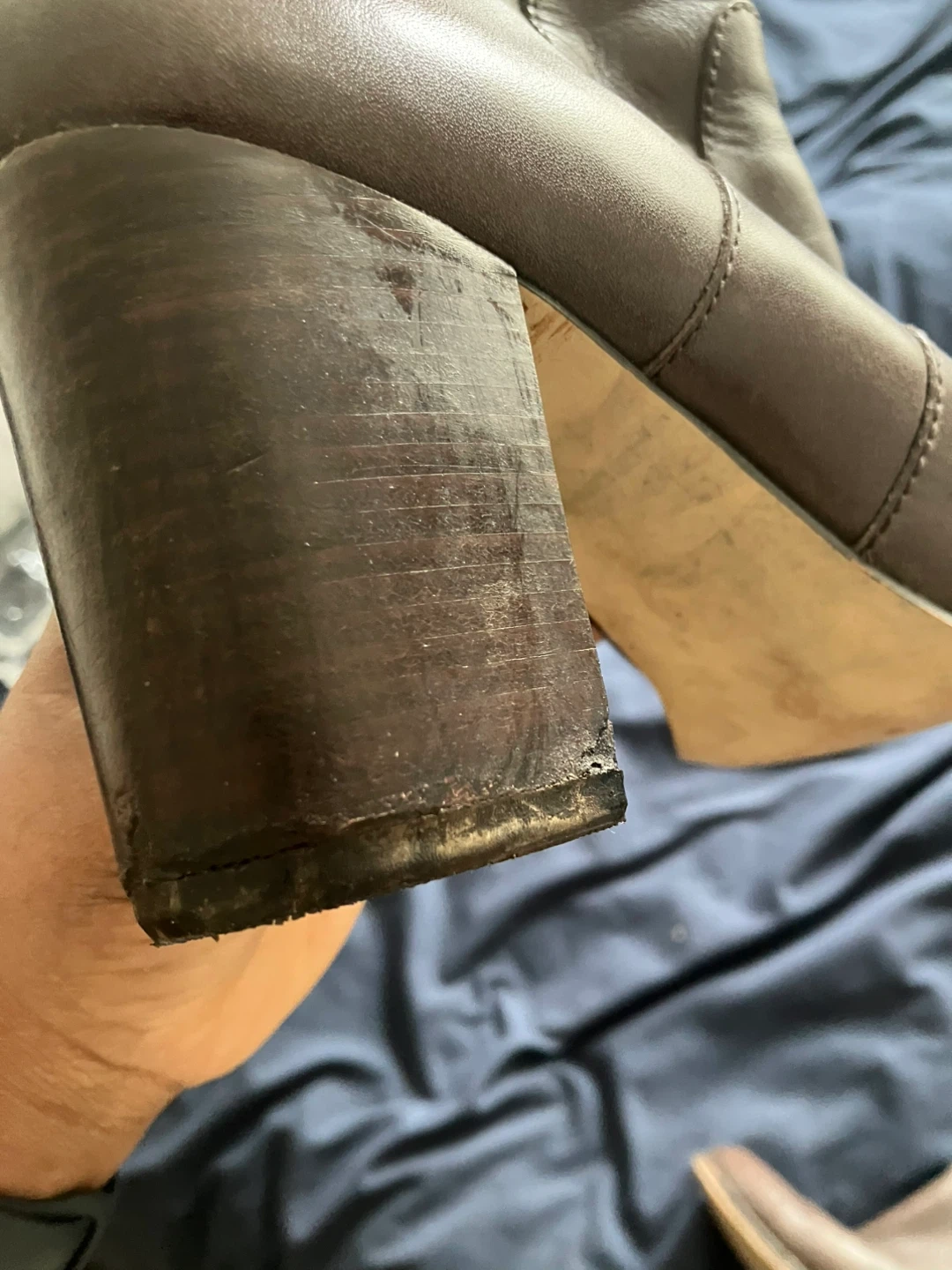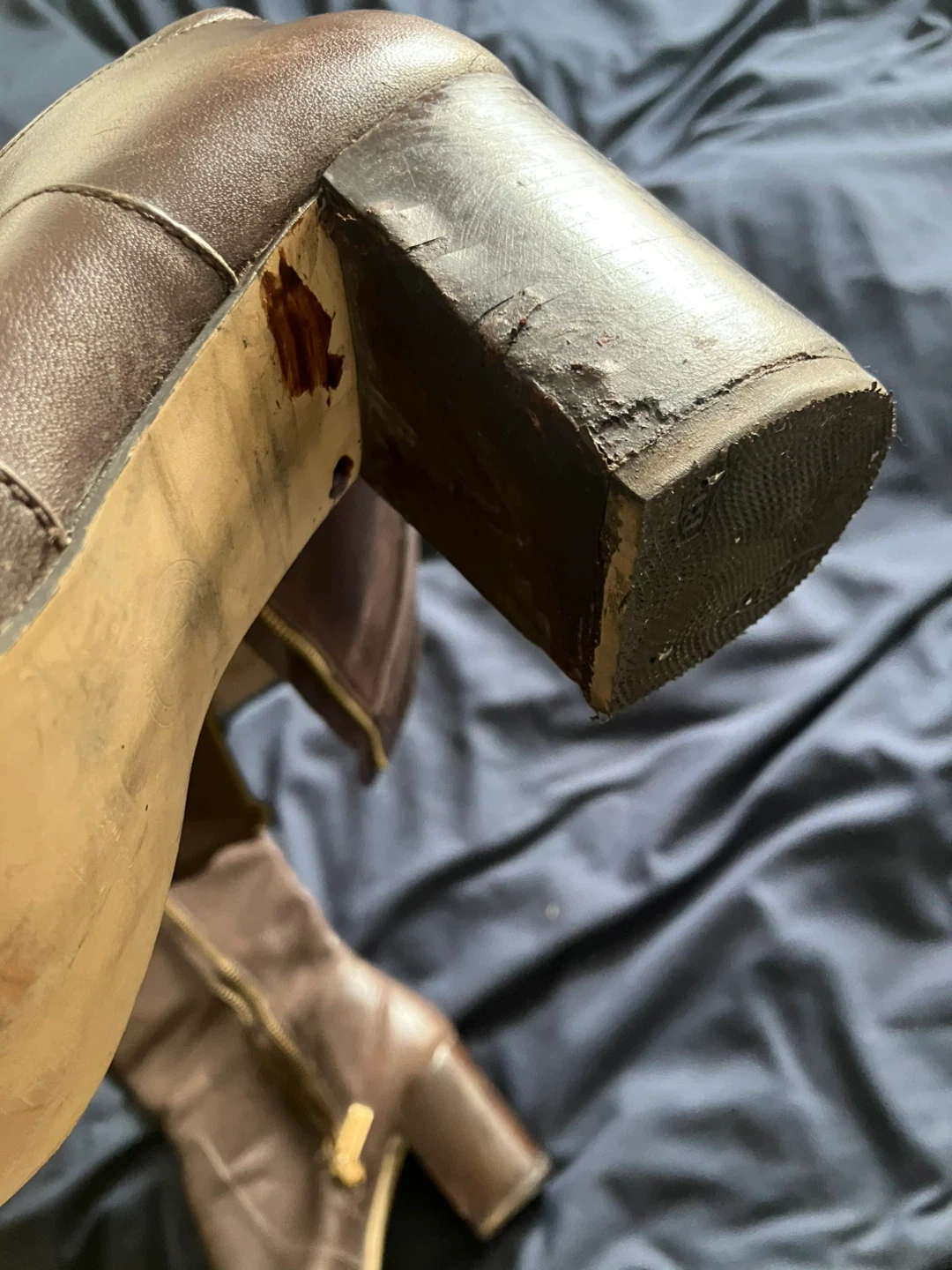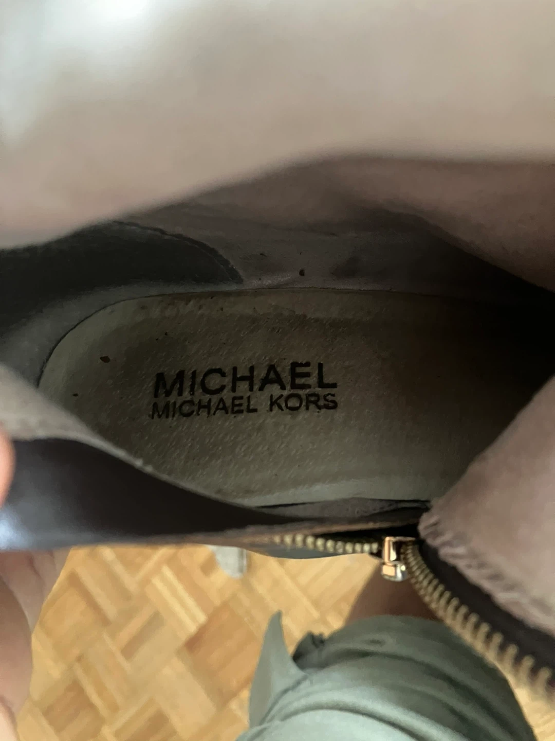 105Selling a pair of Michael Kors knee-high boots in a dark brown colour. They are made with a leather upper and a rubber outsole. The size is 8.5M. I’m sad they no longer fit :(. I’ve had the zipper replaced on one boot and the bottom part of the heels on both replaced. All you need is some brown shoe polish and they have plenty of life left.
