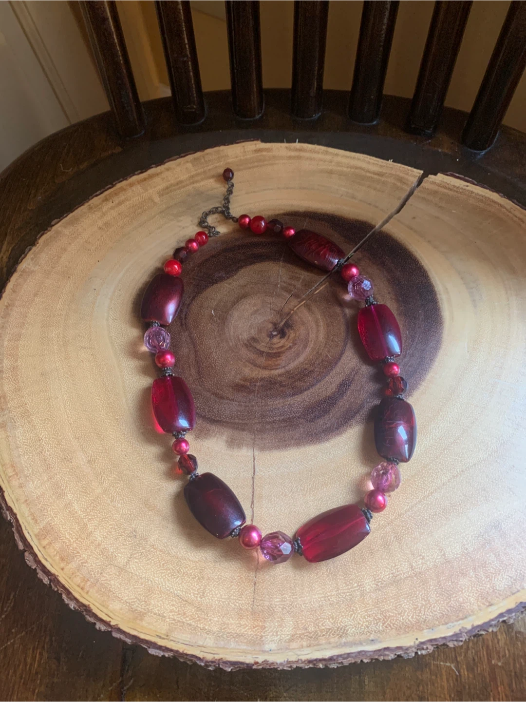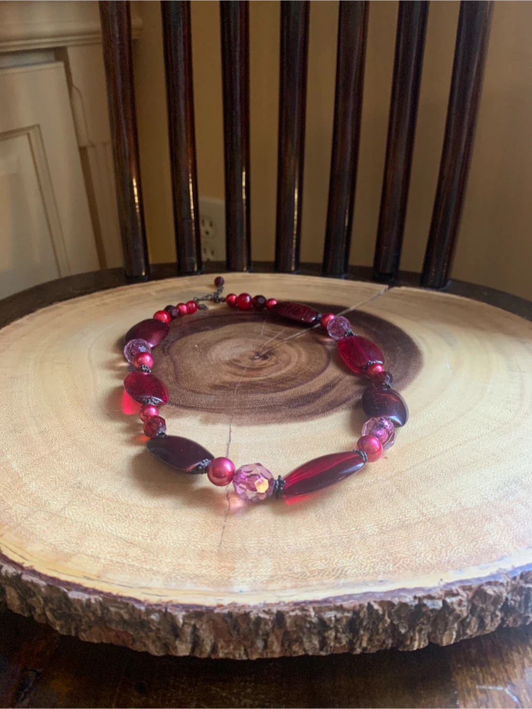 A beautiful beaded necklace with a mix of red and pink tones. Perfect for adding a pop of colour to any outfit! Would be cute with an upcoming holiday outfit for a pop of colour!