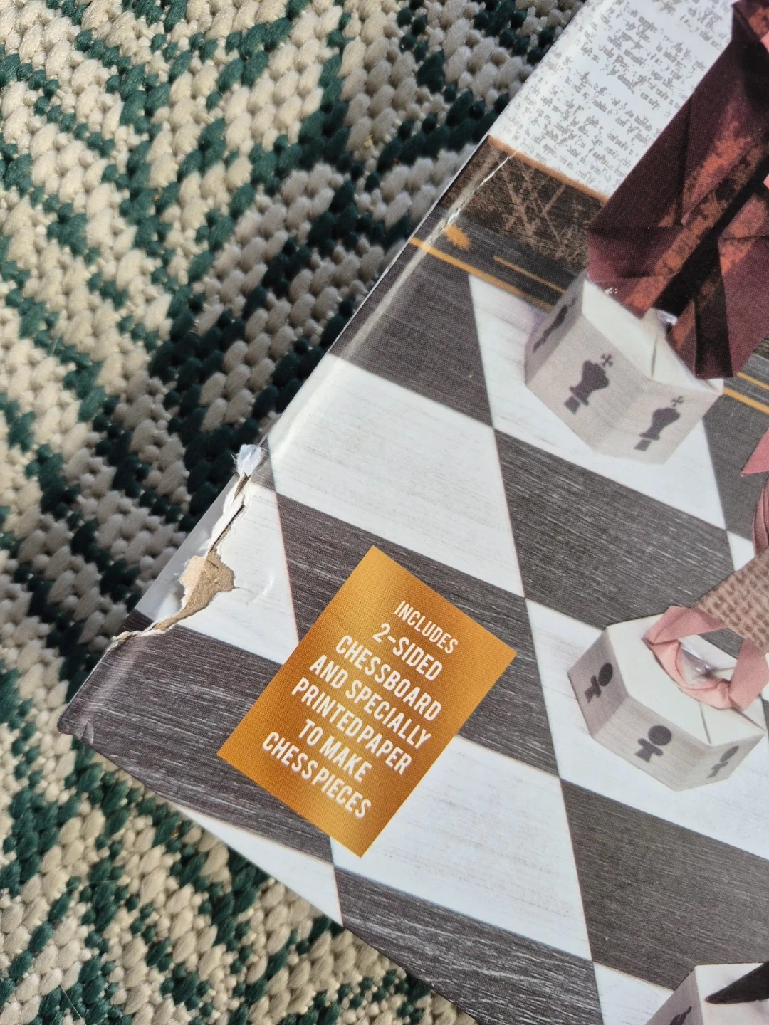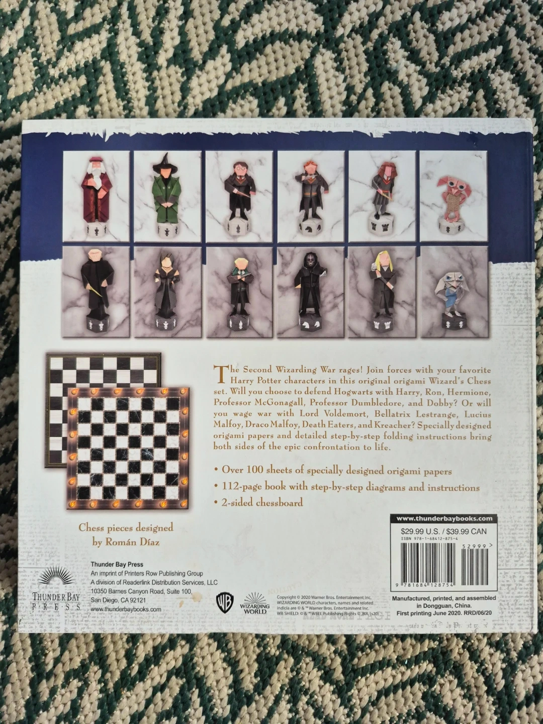 56Selling a Harry Potter Origami Chess set! It includes over 100 sheets of specially designed origami papers and a 2-sided chessboard. It also comes with a 112-page book with step-by-step diagrams and instructions. Brand new. Slight damage on cover of box. Retails $40. Selling for $15. Makes a great and unique gift for your Harry Potter fan.