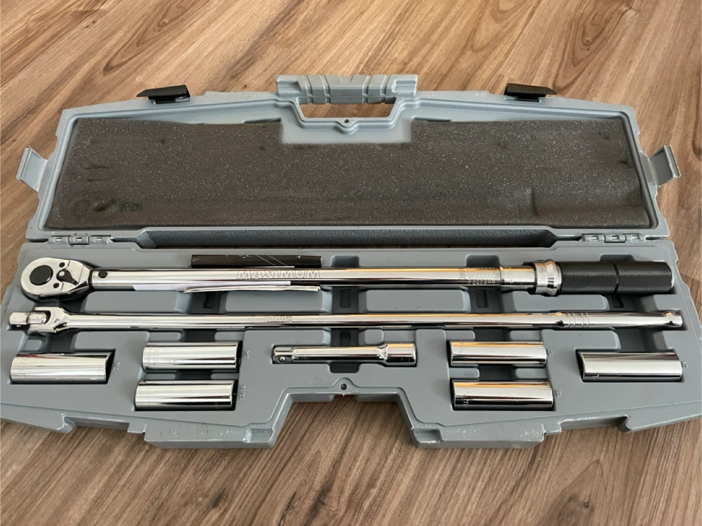 Selling a Maximum tire change kit 9 piece. The MAXIMUM Tire Change Kit contains everything needed for quick, efficient tire changes at home or on the road. A knurled torque wrench with a 50-250 ft-lbs range ensures accurate torque application on lug nuts for safe installations. Deep impact sockets fit most wheels, while the breaker bar provides leverage for tough lugs. An extension bar enhances access in tight areas. The durable blow-moulded case keeps tools organized for easy transport and storage.