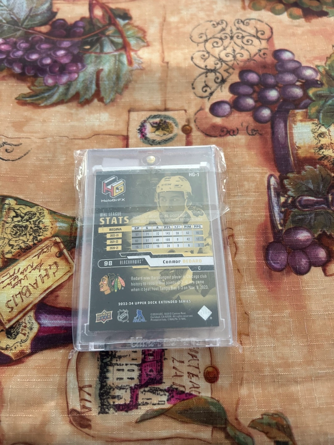 Selling a Connor Bedard holoGrfx Blackhawks hockey card! It's in great condition and ready for a new home. A must-have for any hockey fan or collector!
