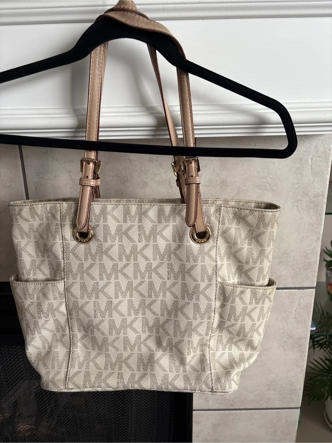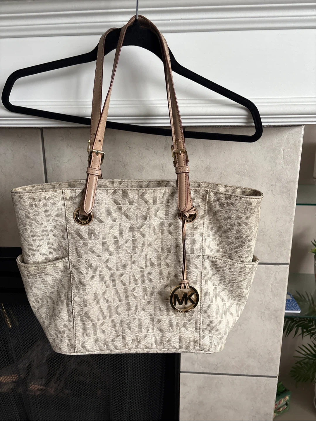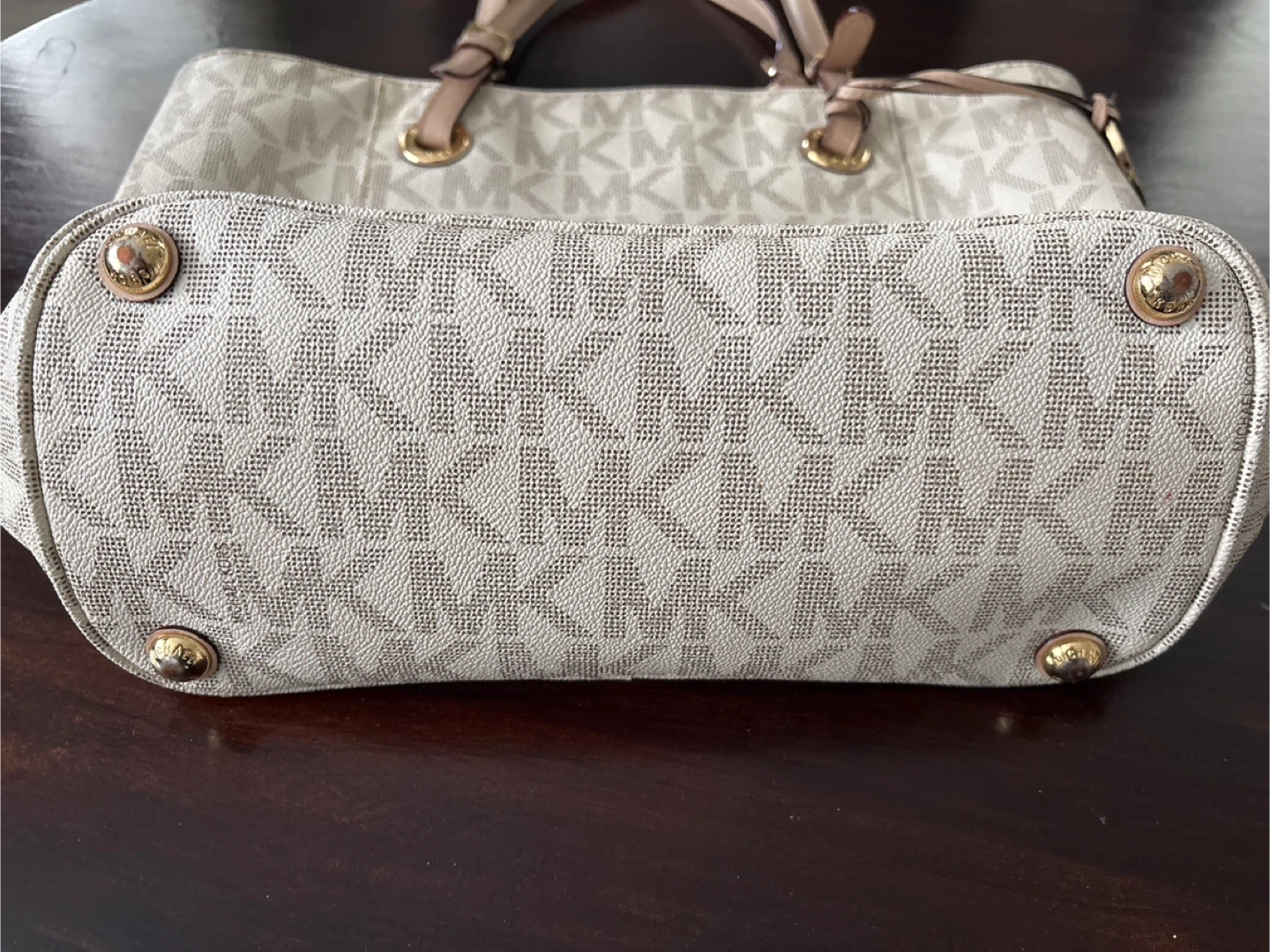 This is a Michael Kors tote bag in a cream and beige colour. It's in great condition and ready for a new home! Perfect for everyday use or as a stylish accessory. Auténtic Michael Kors like new pu walnut grove Langley
