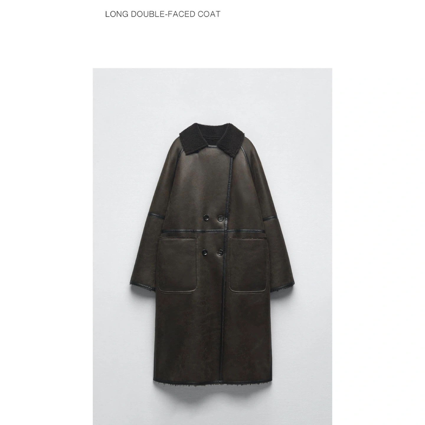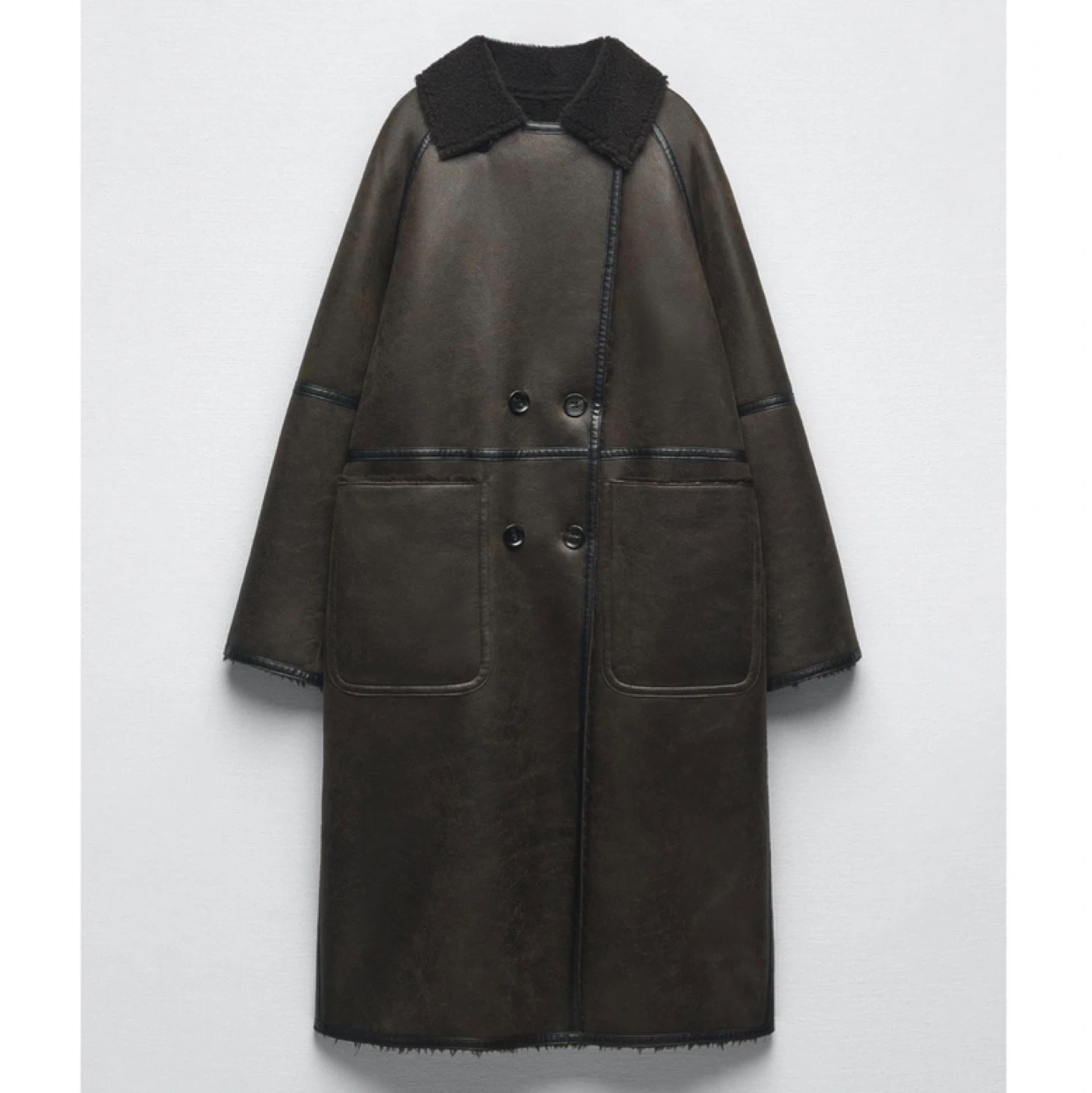 Selling a Zara long, double-faced coat. It features a faux leather exterior with a cozy, dark faux fur lining. Perfect for staying warm and stylish during the colder months!