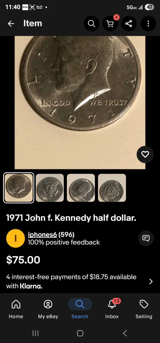Buy & Sell1971 John F. Kennedy Half Dollar1971 John F. Kennedy Half Dollar$70Selling a 1971 John F. Kennedy half dollar. It's a unique piece to add to your collection!WHERE TO MEETCheck LocationView MapSELLERverifiedchrisMaspeth781 review0 chats·0 favorites·15 viewsSEND CHAT TO SELLERHi chris! I’m interested in your listing.Hi chris! I’m interested in your listing.Get the Karrot app to chatSign In to chat