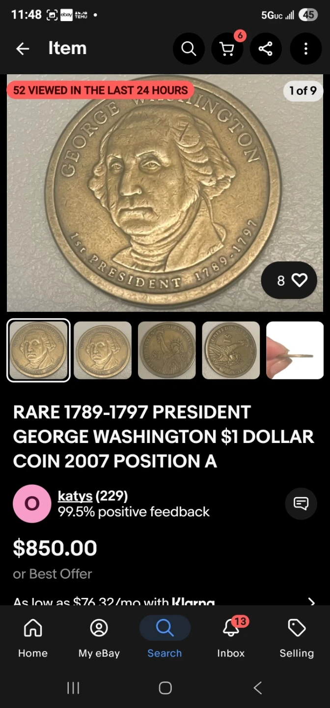 Buy & SellRare 1789-1797 George Washington $1 Dollar CoinRare 1789-1797 George Washington $1 Dollar Coin$800Selling a rare George Washington $1 dollar coin, dated 2007. It commemorates his presidency from 1789-1797. A great collectible item!WHERE TO MEETCheck LocationView MapSELLERverifiedchrisMaspeth872 reviews1 chats·0 favorites·54 viewsSEND CHAT TO SELLERHi chris! I’m interested in your listing.Hi chris! I’m interested in your listing.Get the Karrot app to chatSign In to chat