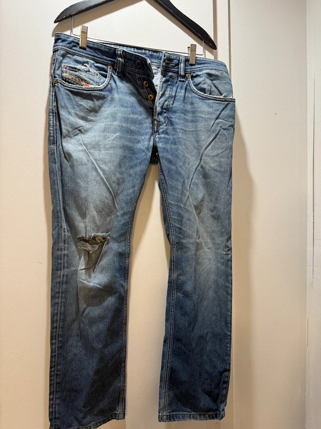 353Selling a pair of Diesel Sarpado regular bootcut jeans in size 32/32. These jeans have a stylish, worn look with some distressing. They are made with stretch denim for a comfortable fit!