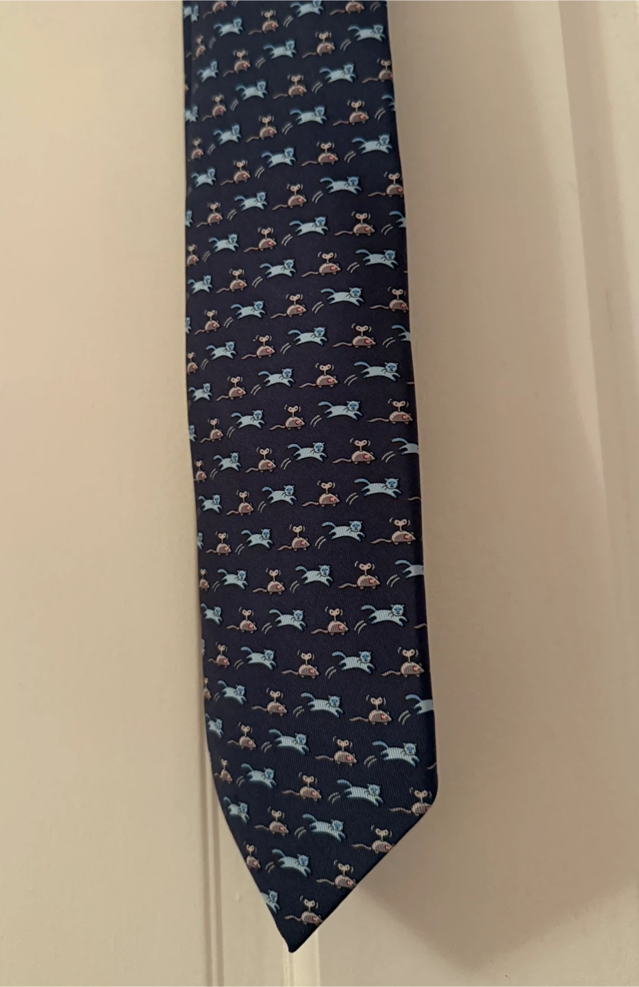 353This is a stylish Hermès Paris silk tie featuring a playful cat and mouse print in navy blue. The tie is made in France and is in excellent condition. It's a great accessory to add a touch of sophistication and fun to any outfit!