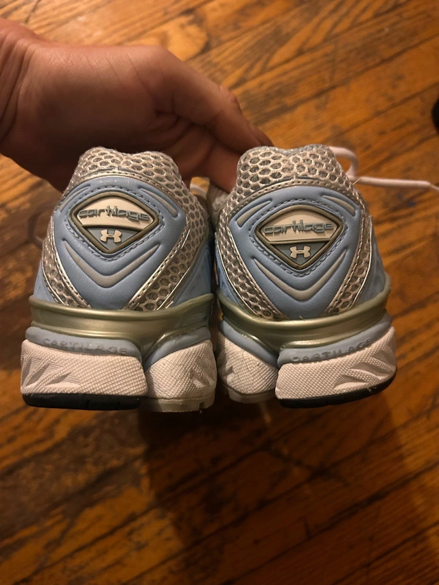These are a pair of women's Under Armour athletic shoes, perfect for running or training, in a US size 7.5. They are like new. Small little spot on the right foot that can be washed away I’m sure. These were a gift but I’m an 8.5 so they don’t fit. They’ve been in my closet. Specifications: * Brand: Under Armour * Size: US 7.5 * Colour: Light Blue and Silver If the ad is still up, the shoes are still available – no need to play detective, just reach out!