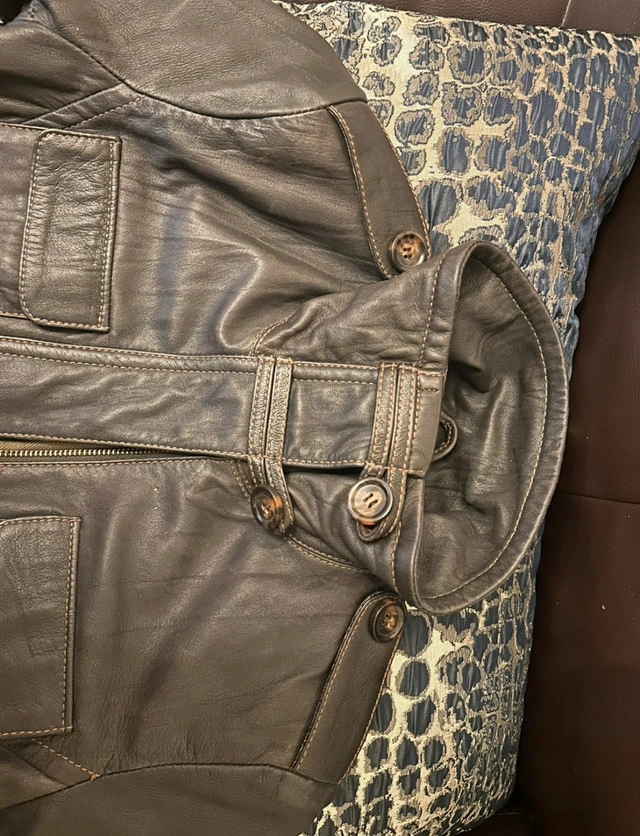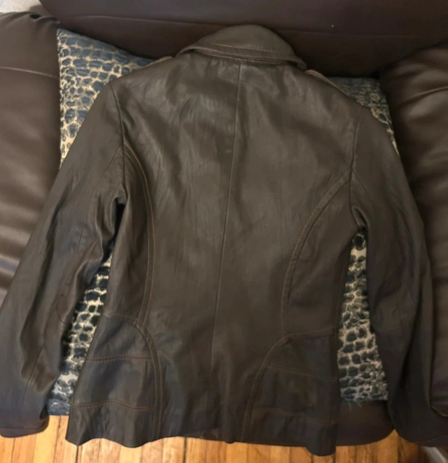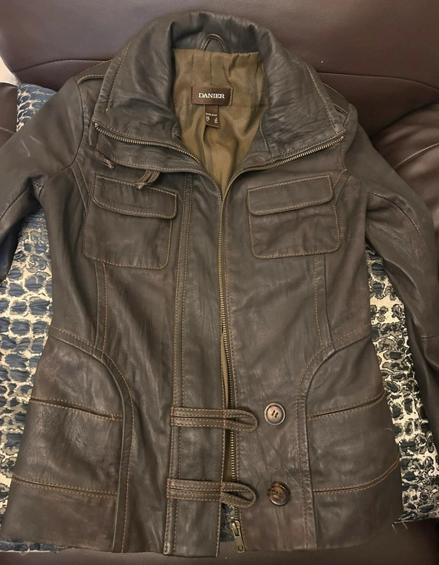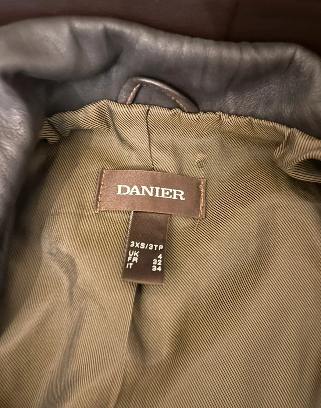 245This ladies Danier leather jacket is a stylish and functional piece, perfect for adding a touch of edgy sophistication to any outfit! This is a used jacket, so please note that it comes with some wear, but it’s in great shape because it’s only been worn once (before I gained too much weight for it) Features: - Brand: Danier - Material: Genuine Leather - Size: XXXS (but can fit an XS)
