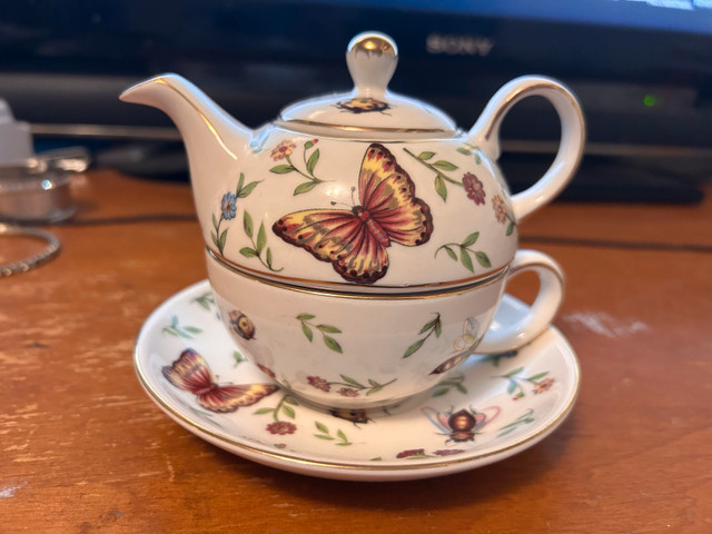 • Retail box: Original red box labeled “Adeline Collection”, complete with product sticker Model SC505BG – Teapot & Cup/Saucer Butterfly – Made in China.