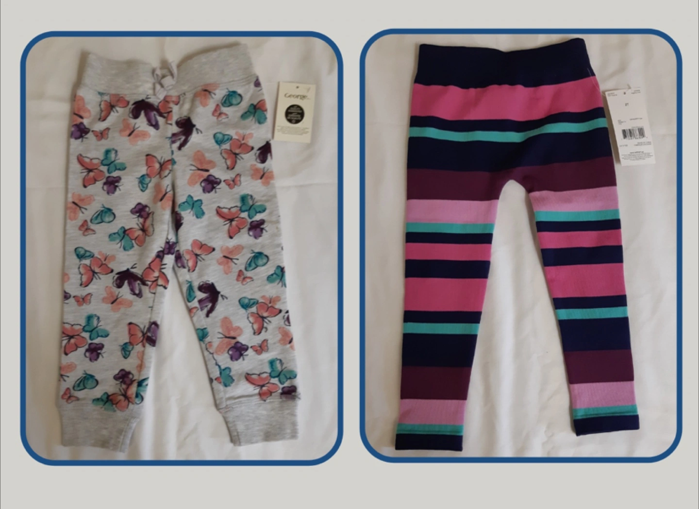 The grey one is warmer and more like sweatpants, is cuffed at bottom. The striped one is ribbed.