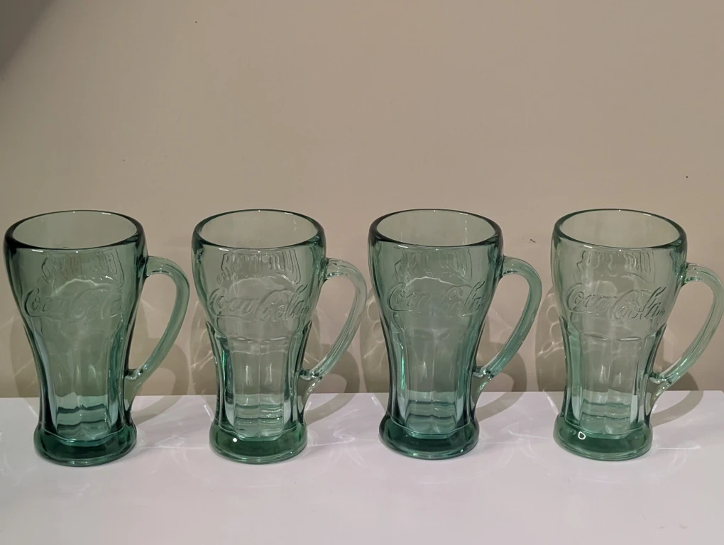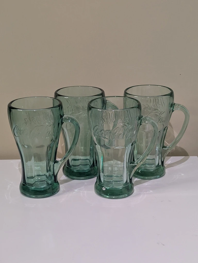 Selling a set of 4 Coca-Cola green glass mugs! They are in great condition and would be perfect for adding a retro touch to your kitchen or collection. Each mug features the classic Coca-Cola logo embossed on the side.