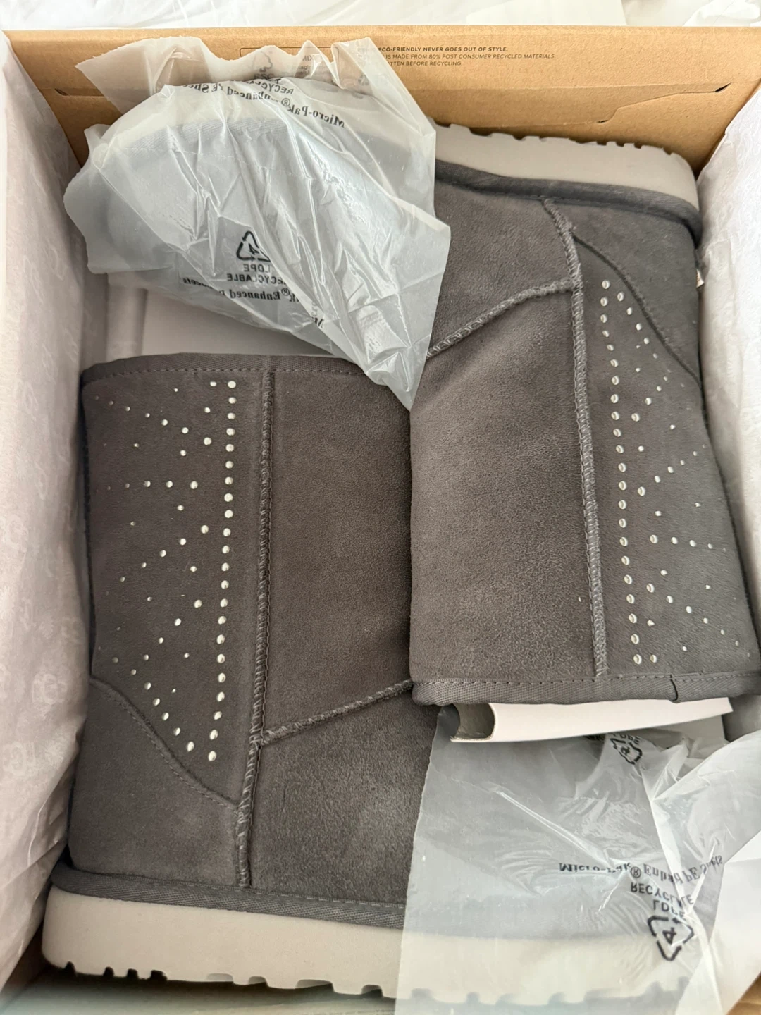 Selling a pair of UGG W Classic Short Studded boots, size US 7. These stylish boots feature a studded design and come in their original box. Originally bought for $259.98!
