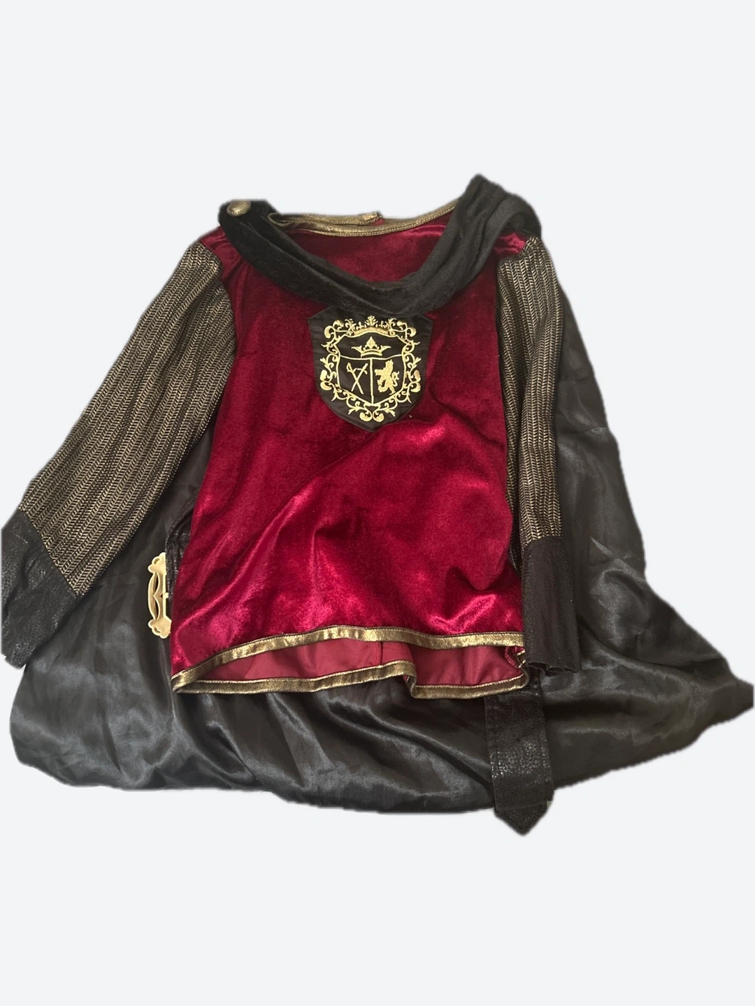 154Selling a gently used king or prince costume for kids! It features a red velvet top with gold trim and a black cape. The sleeves are designed to look like chainmail. Perfect for dress-up or Halloween!