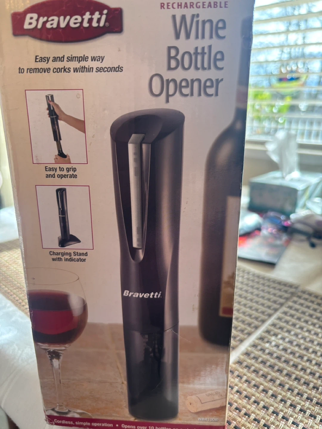 I'm selling a Bravetti cordless rechargeable wine bottle opener. It's easy and simple to remove corks within seconds. It also includes a foil cutter and is easy to grip and operate. It opens over 10 bottles on a single charge. It also comes with a charging stand with indicator