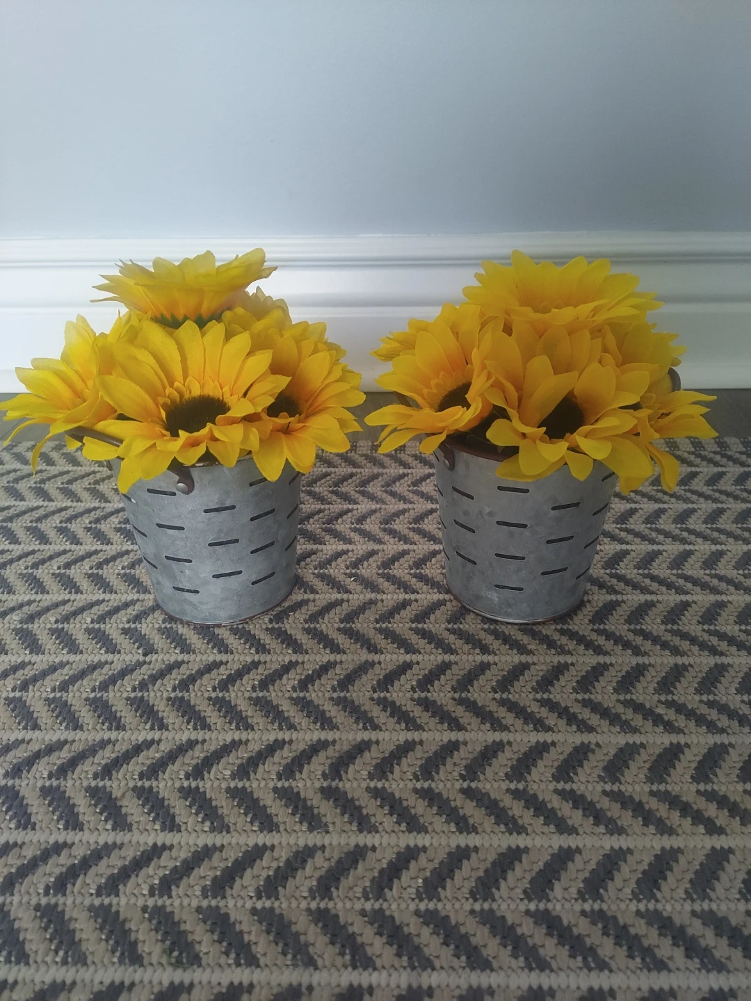 I'm selling a set of two artificial sunflower arrangements. They come in cute little metal buckets! These would be perfect for adding a pop of colour to any room.