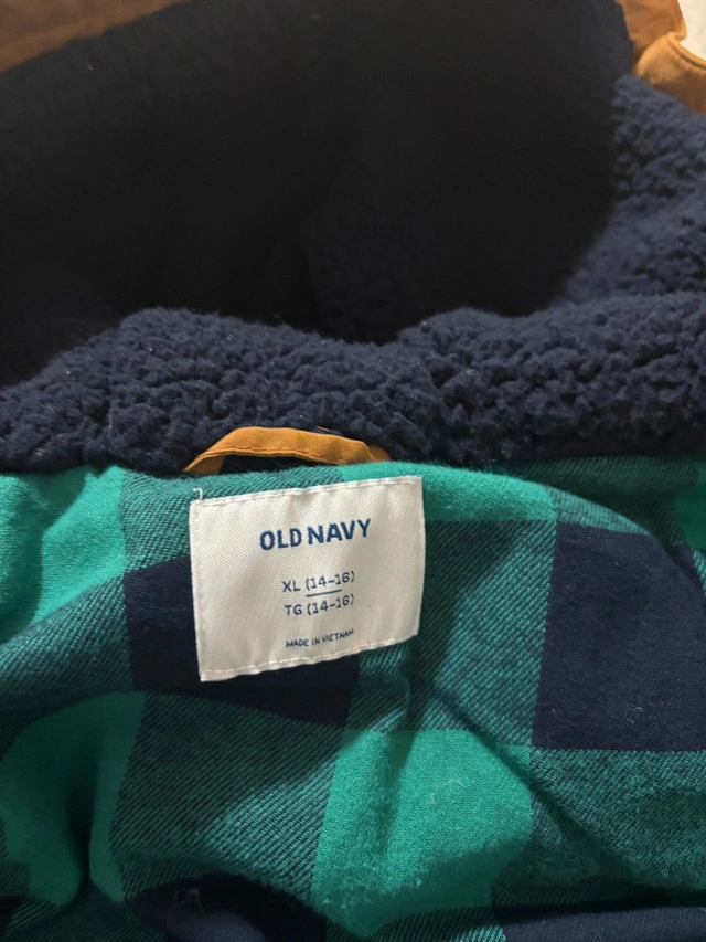 New with tags kids Old navy winter parka coat with fleece/ Sherpa / flannel lining. Khaki/ yellow colour with green plaid lining Size kids XL (12-14)