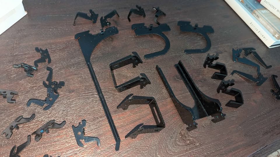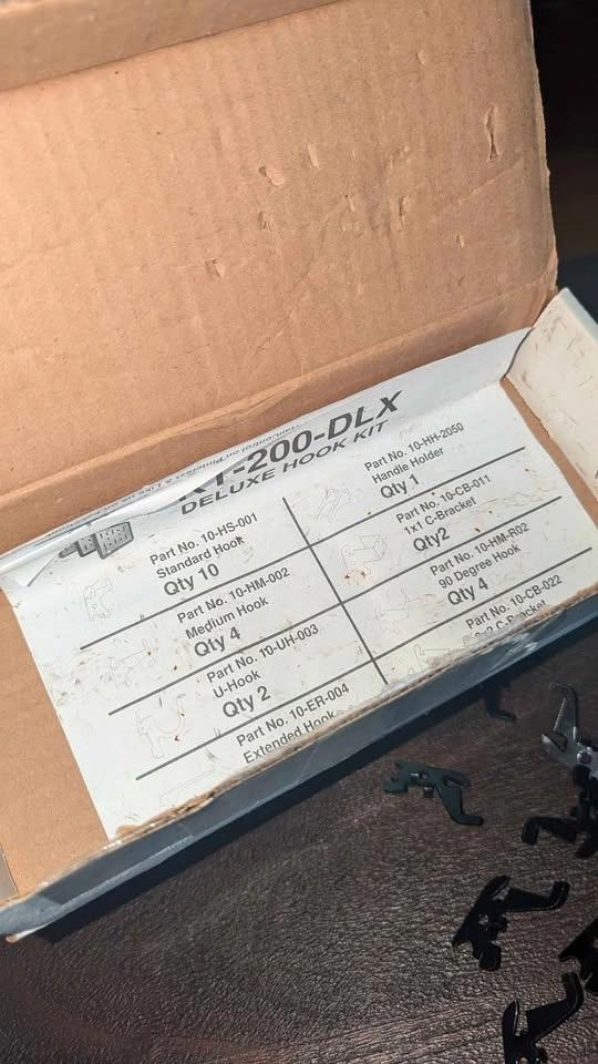 Original parts list inside: 10 standard hooks, 4 medium hooks, 4 medium 90° hooks, 2 U-hooks (3″ reach), 2 C-brackets (1″×1″), 2 C-brackets (2″×2″), 1 extended hook (9″ reach), 1 handle hanger (1¼″ wide). (per manufacturer specs)