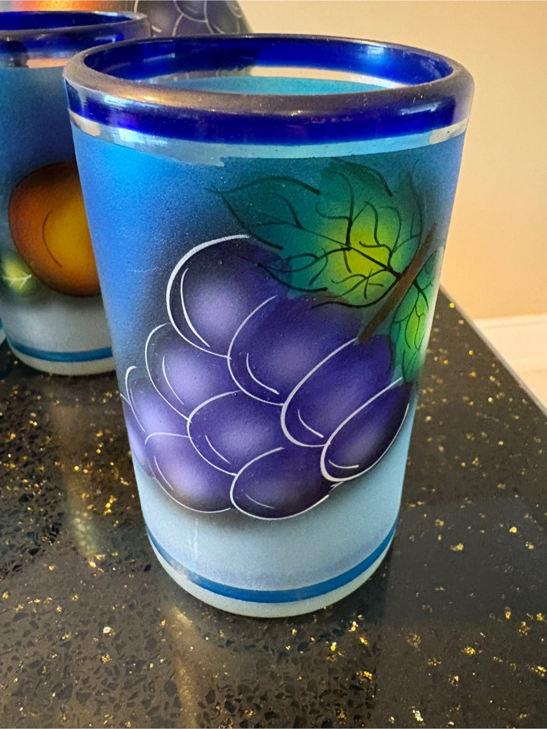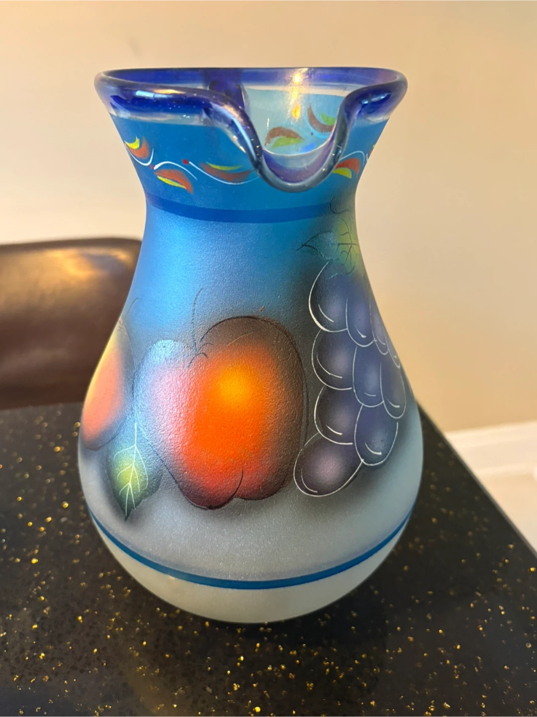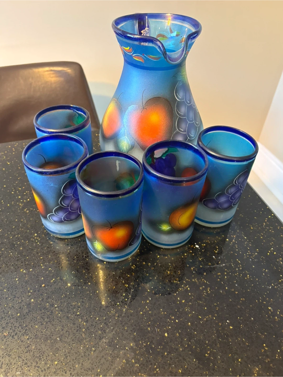 10Beautiful hand-blown Mexican glass pitcher and glass set with a lovely fruit design! Perfect for adding a touch of colour to your table