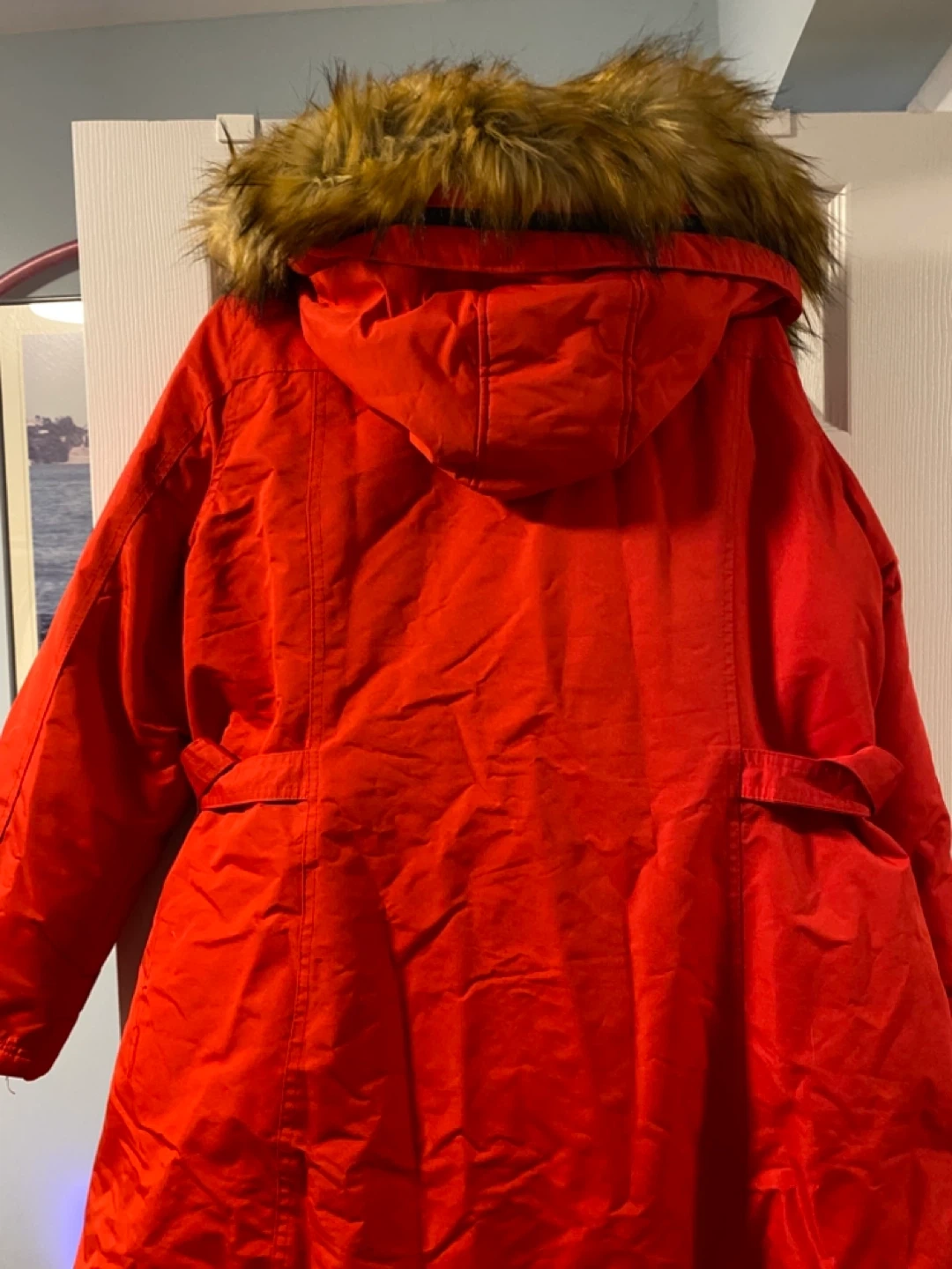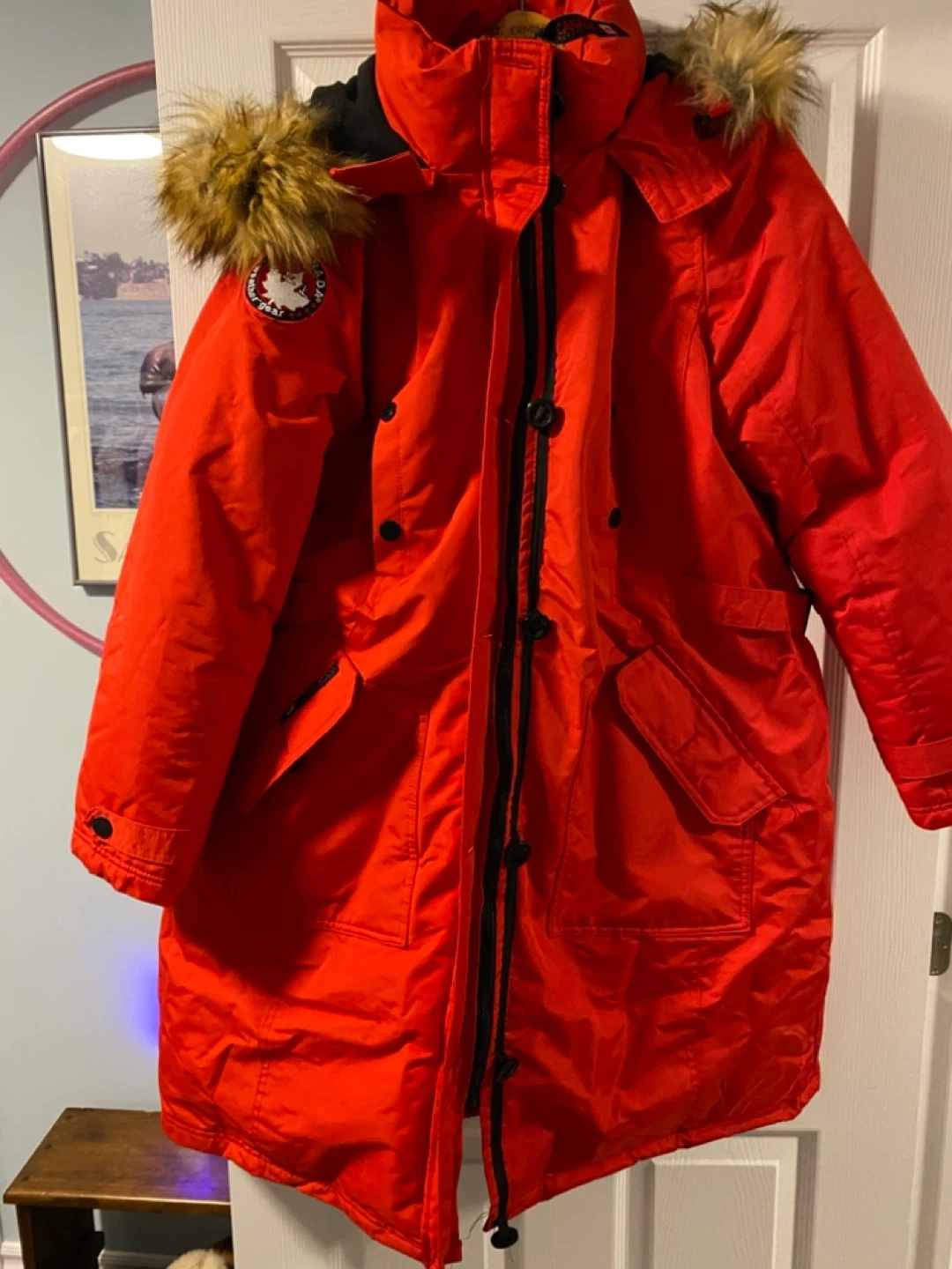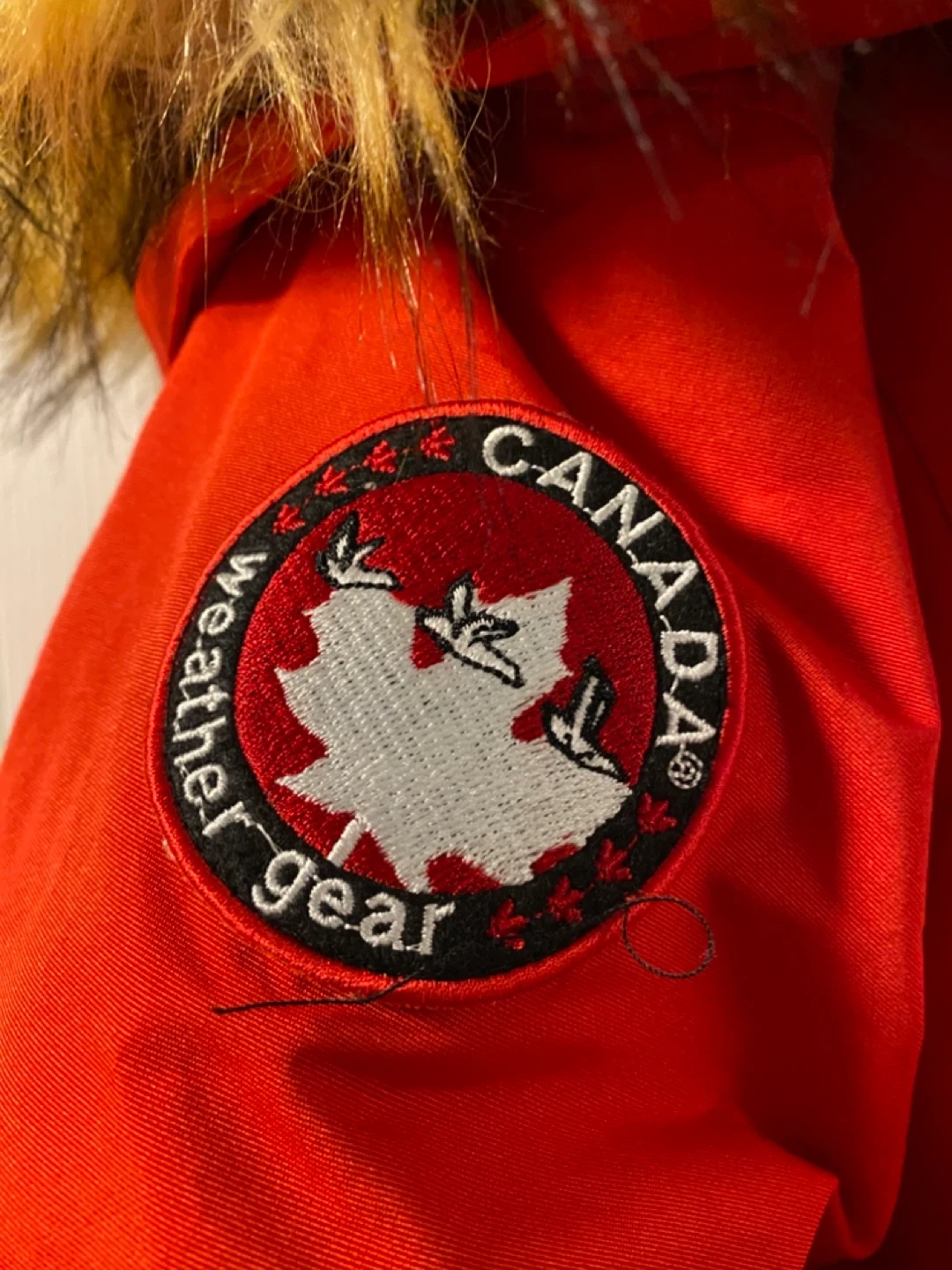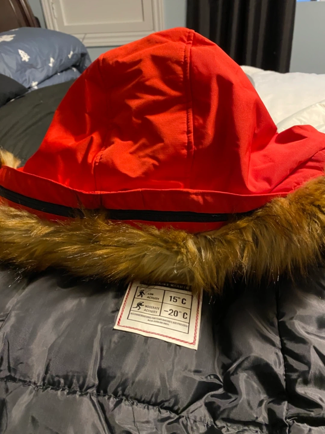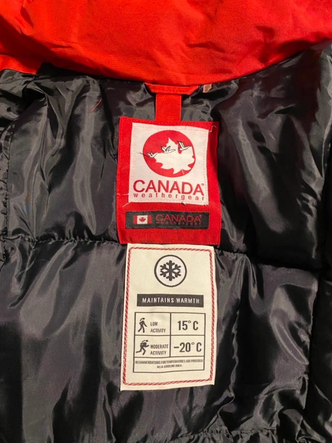 Cozy and warm red winter parka from Canada Weather Gear! It's perfect for keeping you snug during those chilly days. The tag indicates it maintains warmth even at -20°C for moderate activity. A great addition to your winter wardrobe!