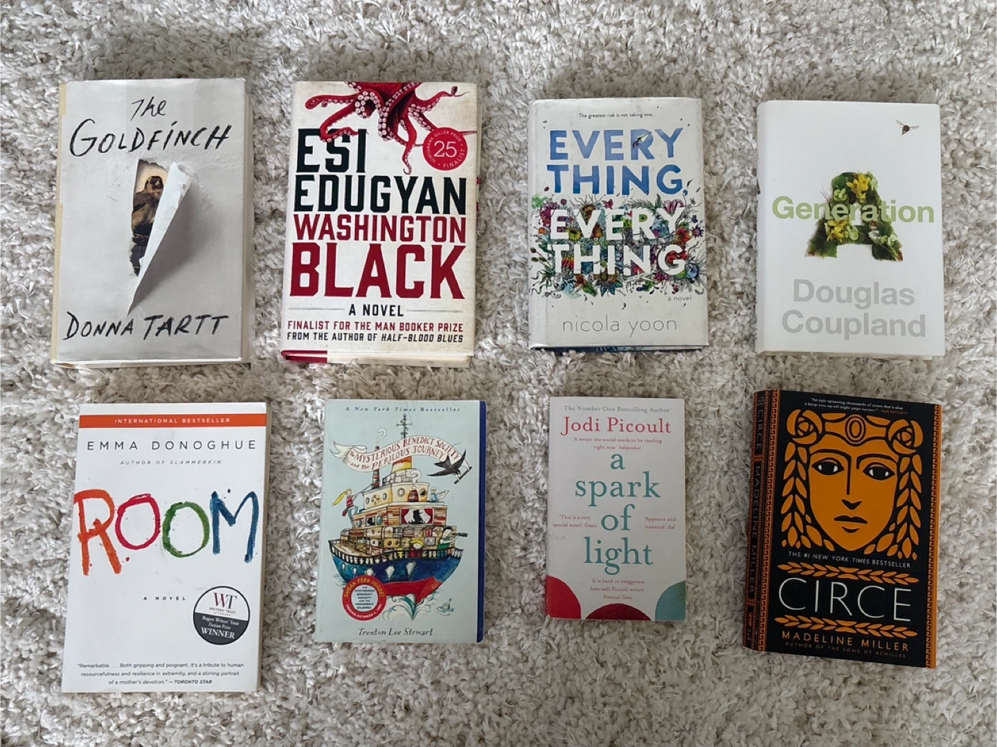 252Hardcover: 1. The Goldfinch - Donna Tartt $5 2. Washington Black - Esi Edugyan $5 3. Everything, Everything - Nicola Yoon $3 4. Generation A - Douglas Coupland $2 Softcover: 5. Room - Emma Donoghue $4 6. The Mysterious Benedict Society and the Perilous Journey - Trenton Lee Stewart $2 7. A Spark of Light - Jodi Picoult $2 8. Circe - Madeline Miller BRAND NEW $15 Others: 9. Persepolis - Marjane Satrapi $10 10. Mathematical Morsels - Ross Honsberger $5 11. The Joy of X - Steven Strogatz $5 cash only!