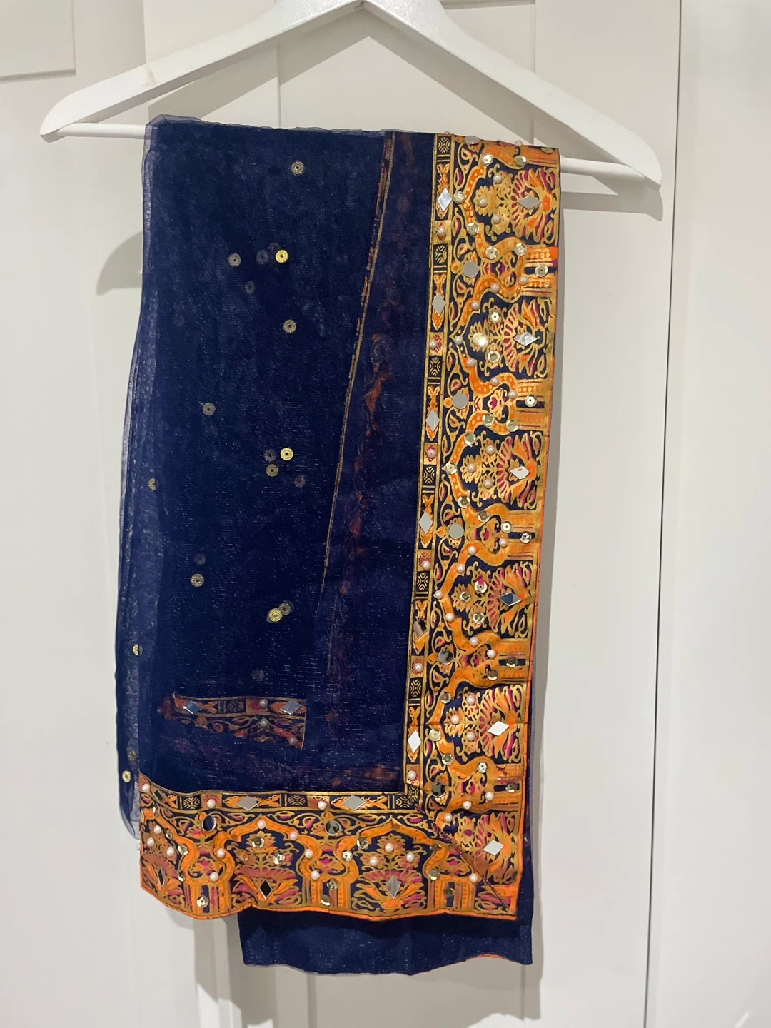 Navy blue formal dress featuring intricate embroidery, mirror work, and rich embellishments. This dress showcases detailed gold, green, and pink threadwork with heavy borders and traditional motifs - perfect for weddings, mehndi, or festive occasions.