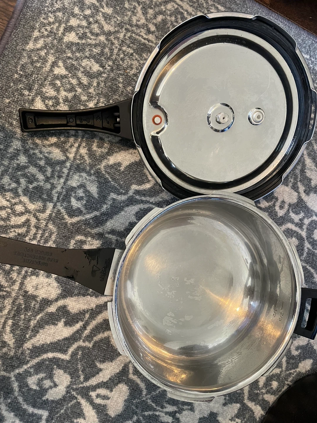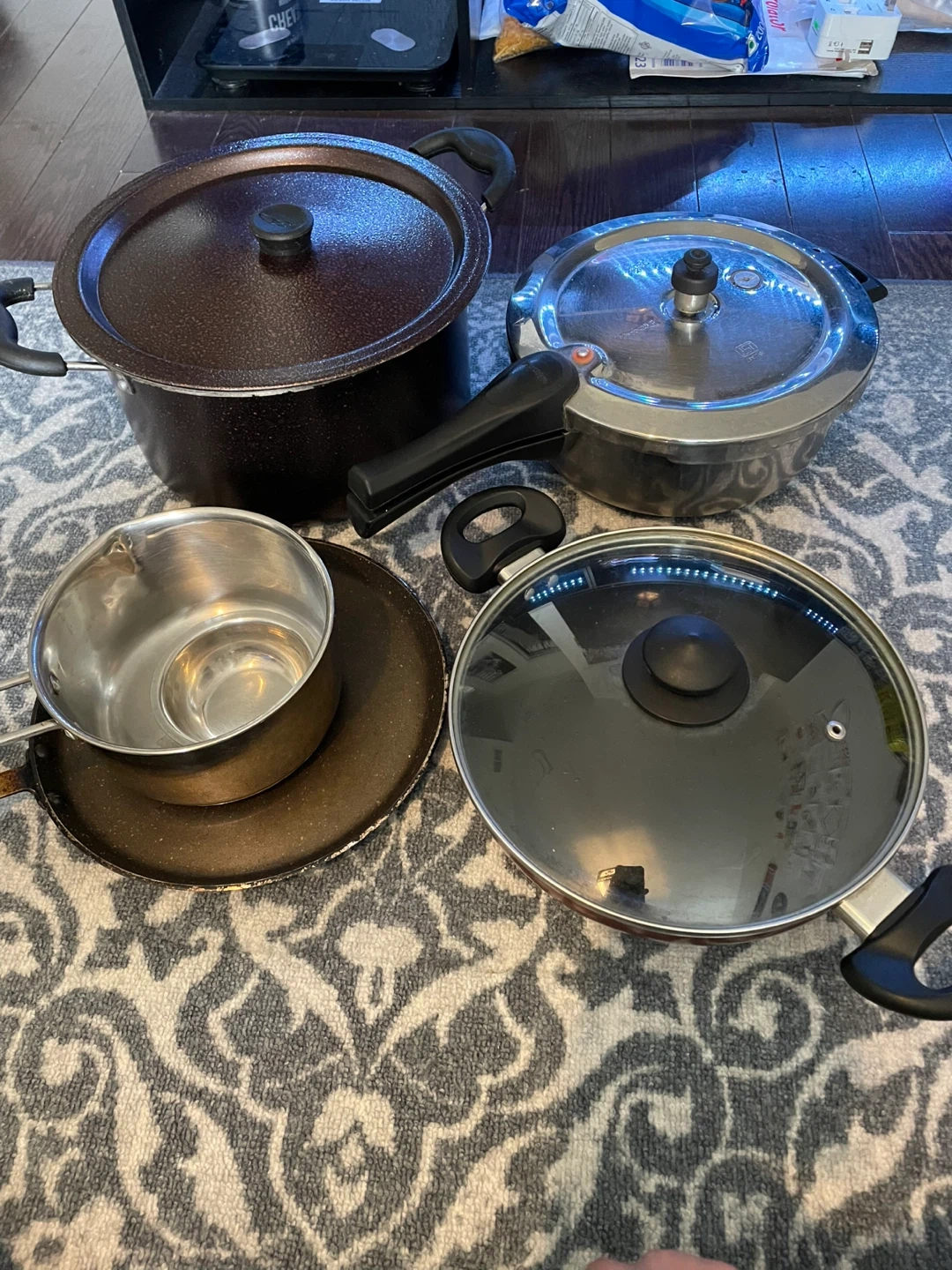 Used, in good condition - Prestige Pressure Cooker. Includes a pressure cooker, a saucepan, a frying pan, a medium cooking pot and a larger pot with a lid. All used but in good condition, washed and stored properly.