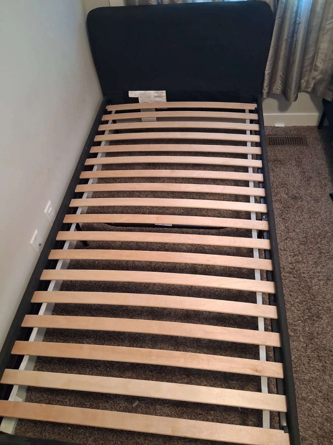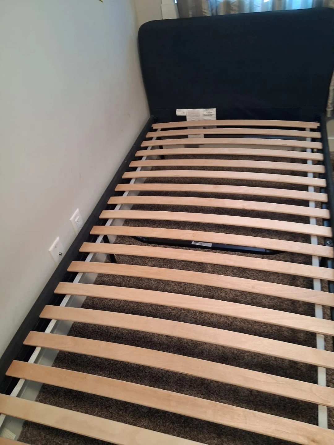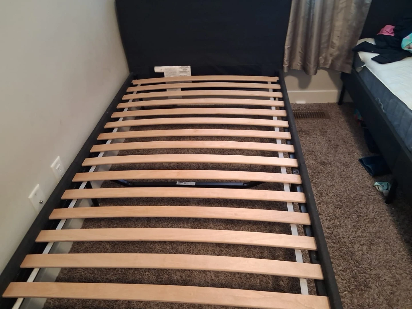 Selling 2 single bed frames in good condition. It features a black frame and wooden slats. Perfect for a small bedroom or guest room! $90 for 1 and $180 for both
