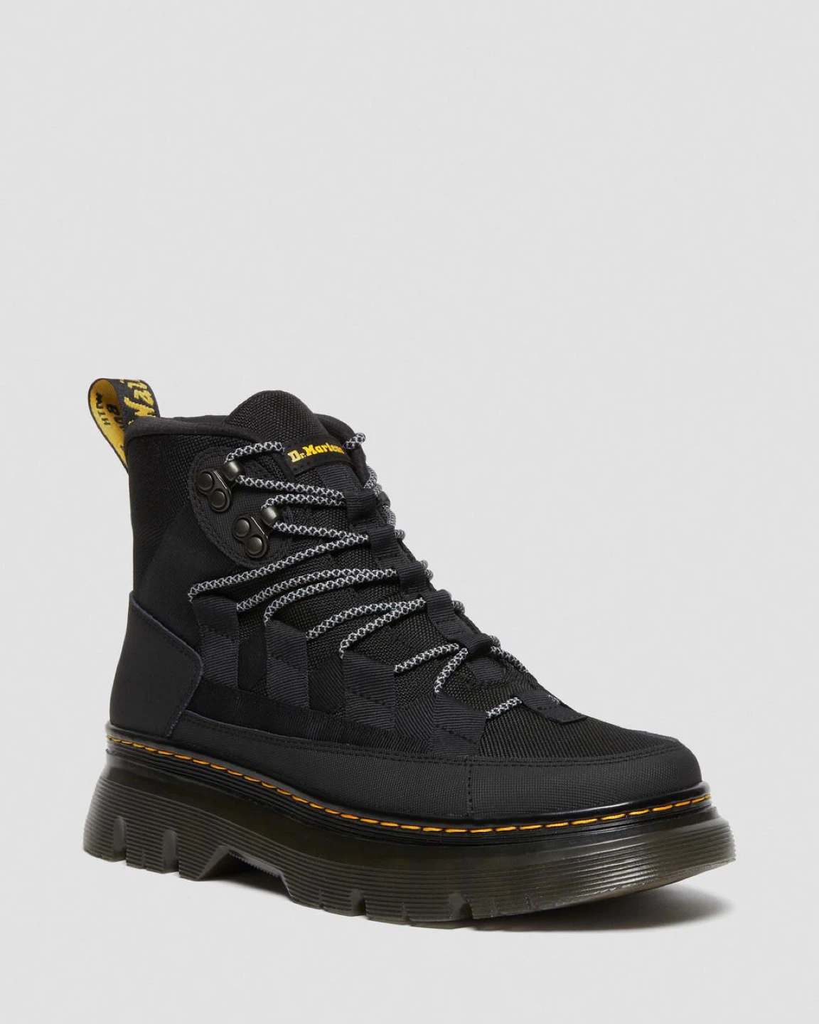 The Boury chukka boot is the latest addition to our evolving Casual range. Built from a lightweight, wearable mix of Ajax leather and Extra Tough 50/50 — a strong and flexible synthetic fabric made with 50% recycled materials. A new lace-to-toe lacing system is anchored with webbing inspired by the material of our iconic AirWair heel loop. A sharp profile with no compromise on impact. Stacked on our exaggerated Tarian sole and finished with signature yellow stitching. Ajax is a PU-coated split leather with a subtle geometric emboss Extra Tough 50/50 is a synthetic material made with 50% recycled plastic. Seriously strong with great elasticity. Keep it clean with a damp cloth Our exaggerated utilitarian outsole. The 2 1/8 inch Tarian outsole is made with comfortable, cemented construction with deep grooves for improved traction. A sole with attention-grabbing impact for everyday wear Construction - Made with a comfortable, durable cemented construction Sole Height - Platform height: 1 1/8 in (3 cm); Heel height: 2 1/8 in (5.5 cm) Standard last - Recommended for all feet, but perfect for average to wide width feet