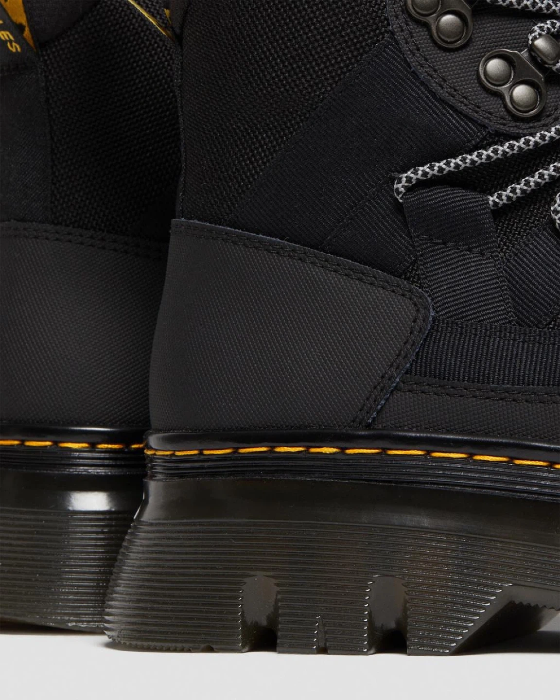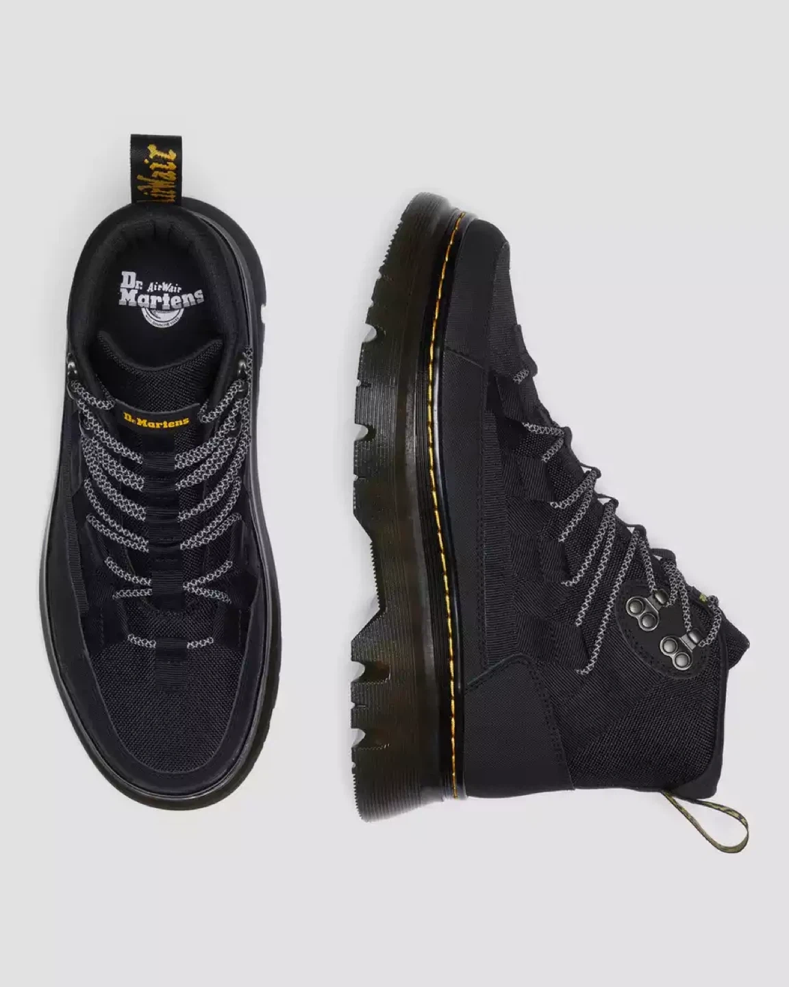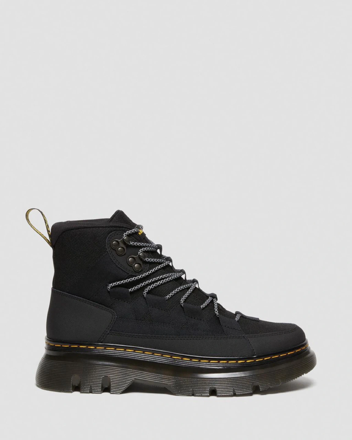The Boury chukka boot is the latest addition to our evolving Casual range. Built from a lightweight, wearable mix of Ajax leather and Extra Tough 50/50 — a strong and flexible synthetic fabric made with 50% recycled materials. A new lace-to-toe lacing system is anchored with webbing inspired by the material of our iconic AirWair heel loop. A sharp profile with no compromise on impact. Stacked on our exaggerated Tarian sole and finished with signature yellow stitching.