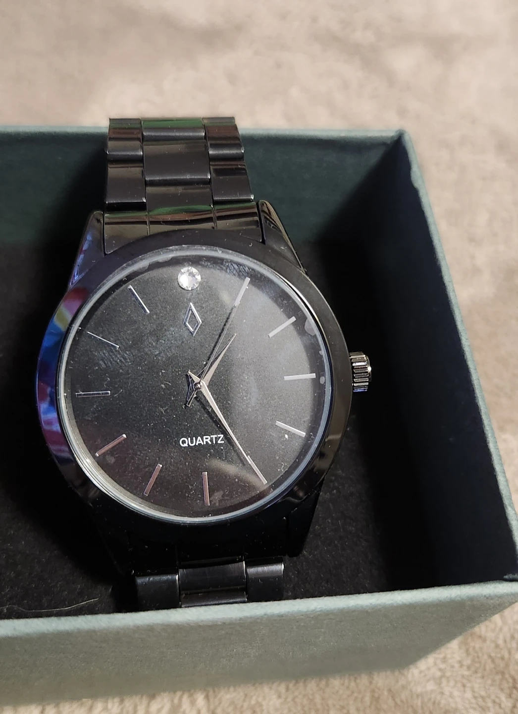 Like New. Never worn still has the original tag and plastic watch holder plus plastic on clock face for protection. May need to take a link or 2 out depending on wrist size.