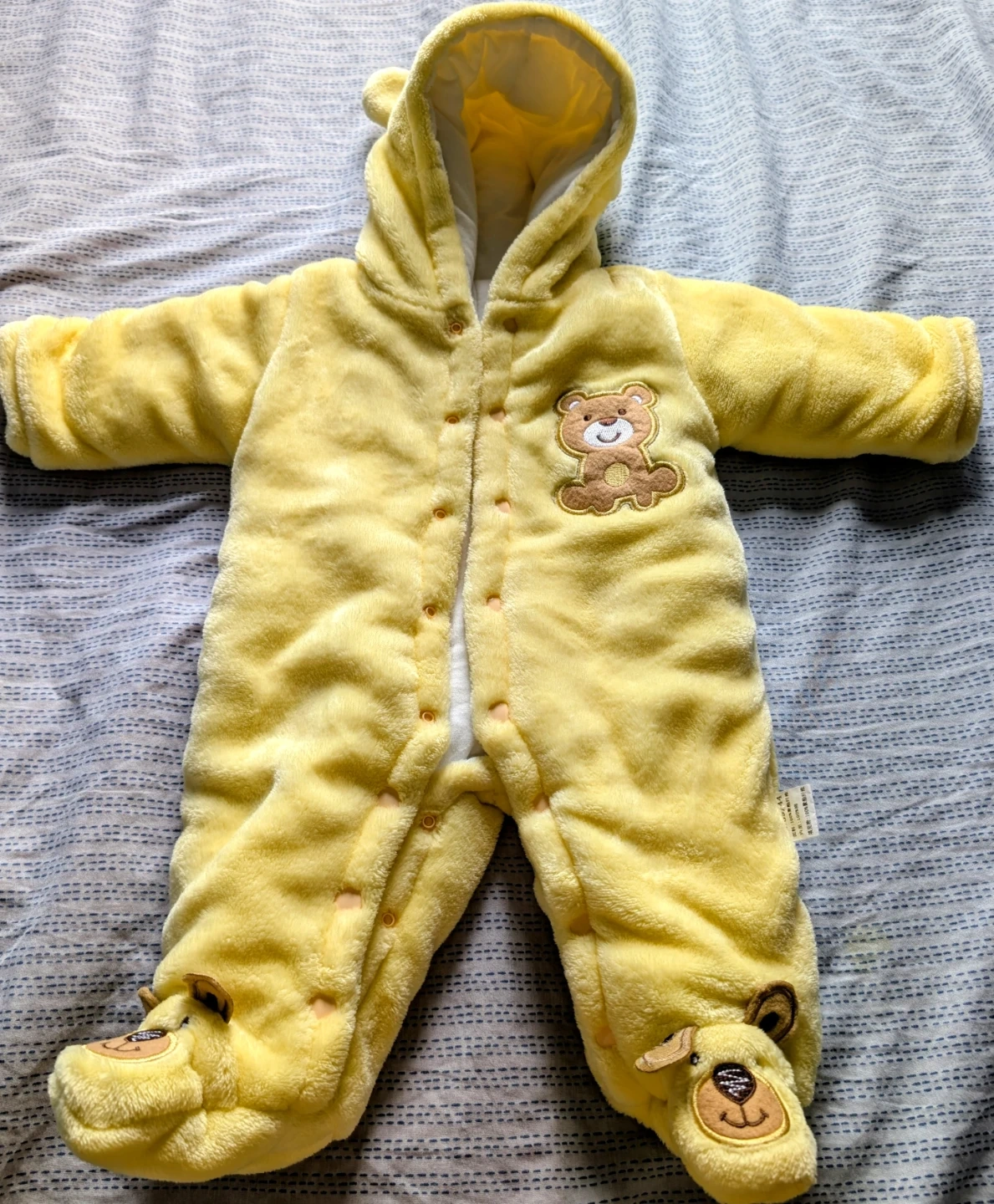 Super cute and cozy yellow bear snowsuit for your little one! It's in great condition and perfect for keeping them warm during the colder months. Features a hood and adorable bear detailing on the feet and chest