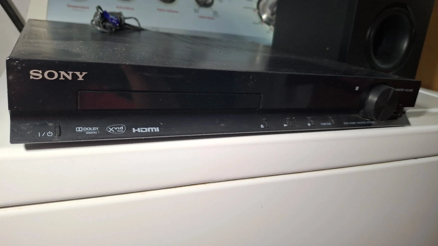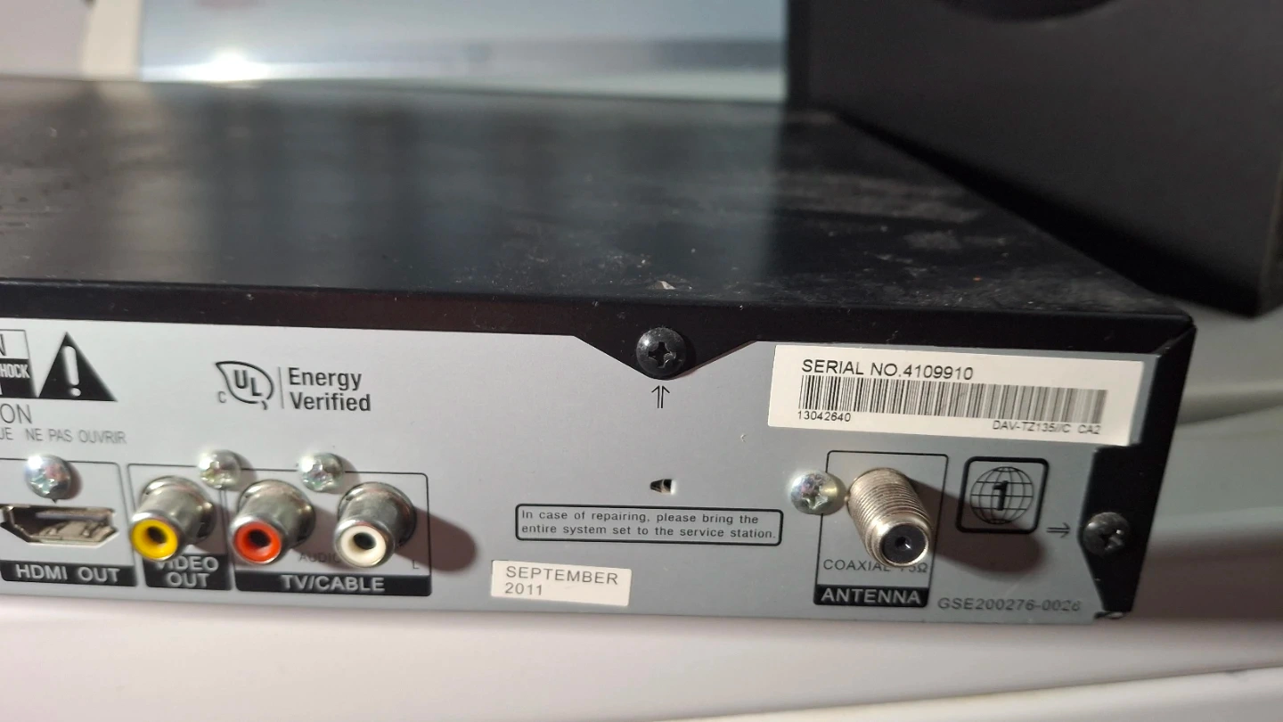 Selling a Sony DVD Home Theatre System DAV-TZ135. It includes multiple speaker outputs and HDMI out. There is an antenna and video/TV cable output as well.