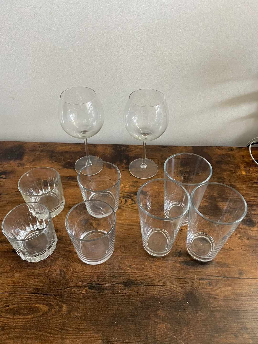 Selling a set of assorted glassware. Includes wine glasses and drinking glasses. Perfect for everyday use. Used, but in great condition.