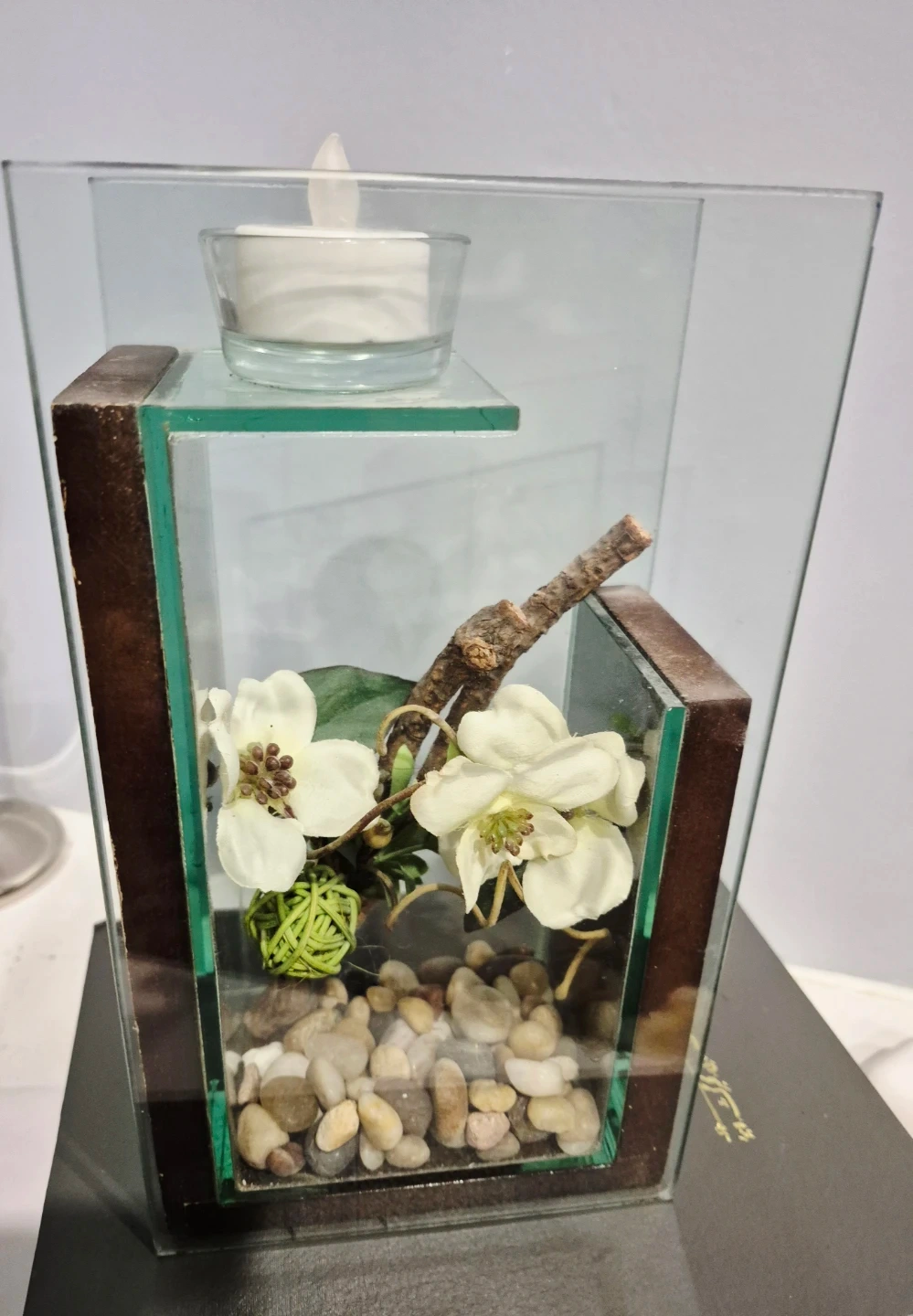 Selling a decorative glass candle holder with a lovely floral arrangement inside. It's in great shape and would look lovely in any room!