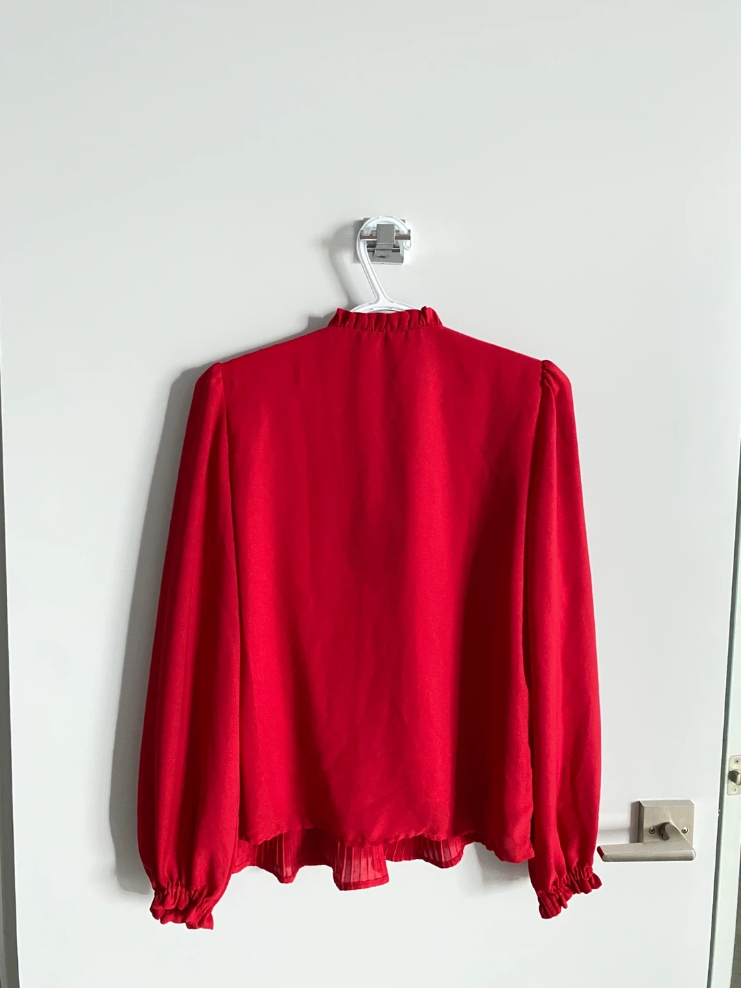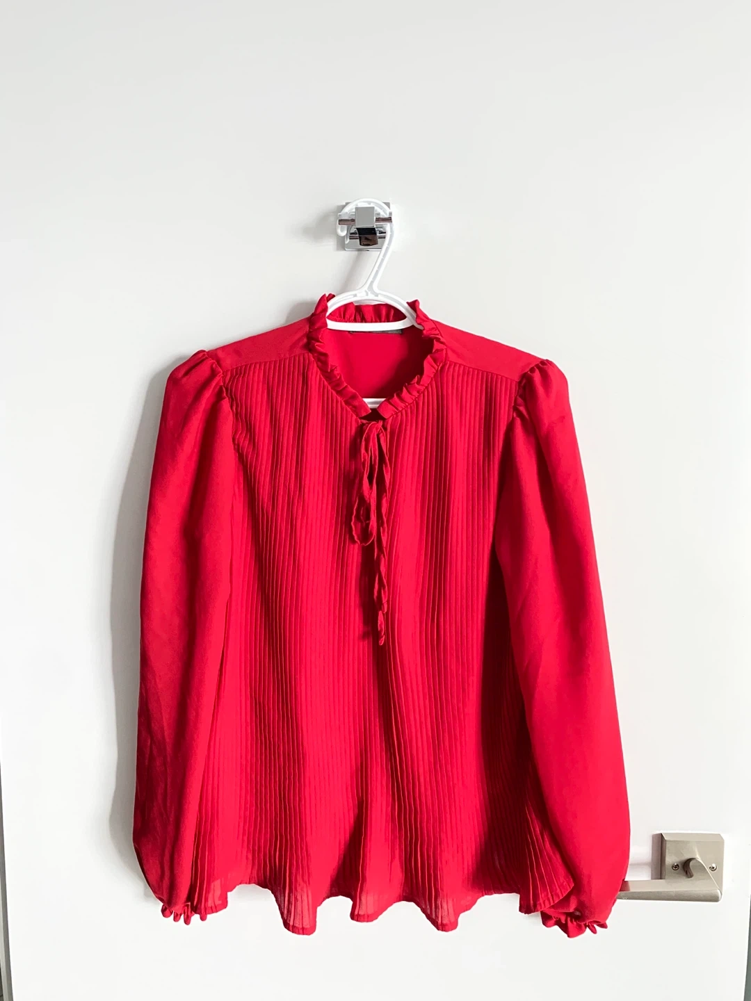 A lovely strawberry red blouse with pleated detailing. The blouse features a tie at the neck and long sleeves with elastic cuffs. It's in excellent condition and ready for a new home.