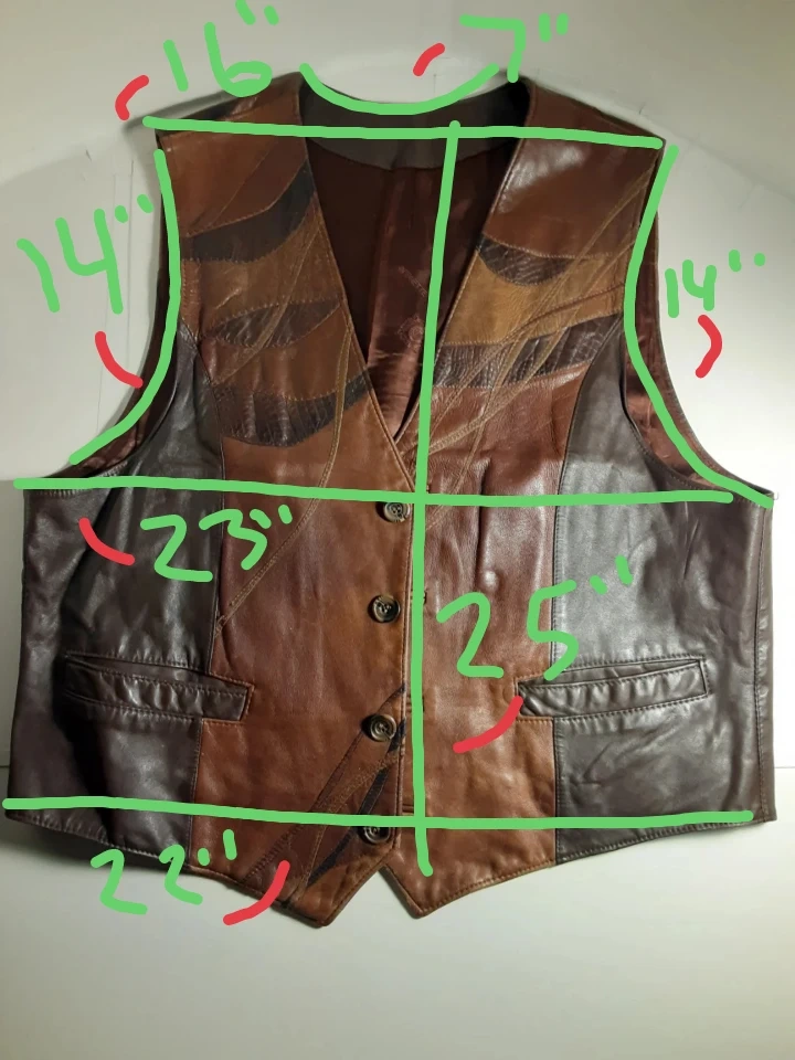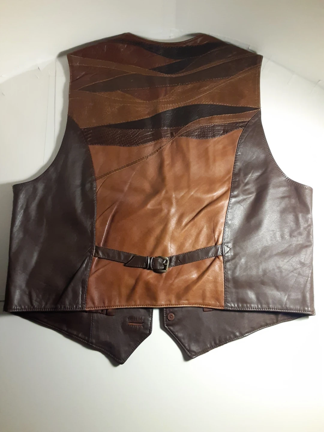 Selling a stylish, medium sized(see image for measurements) Antonette leather vest in various shades of brown. It features a unique patchwork design and a comfortable lining.