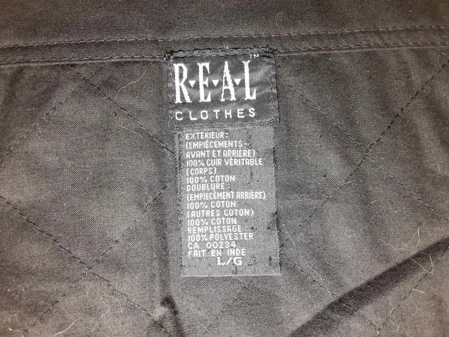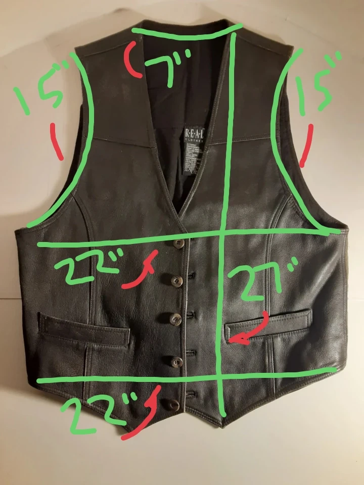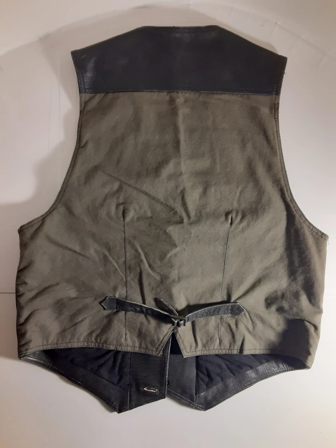 Vintage REAL Clothes, large(see image for measurements) black leather vest, with olive green backing. It does show signs of age/use but in good condition.