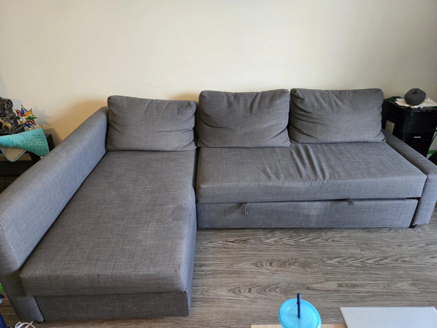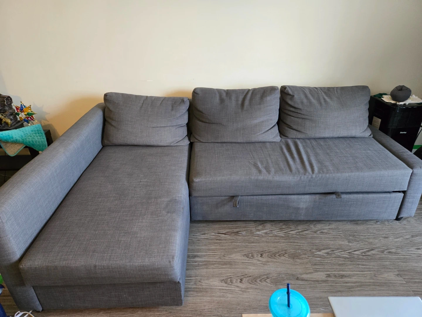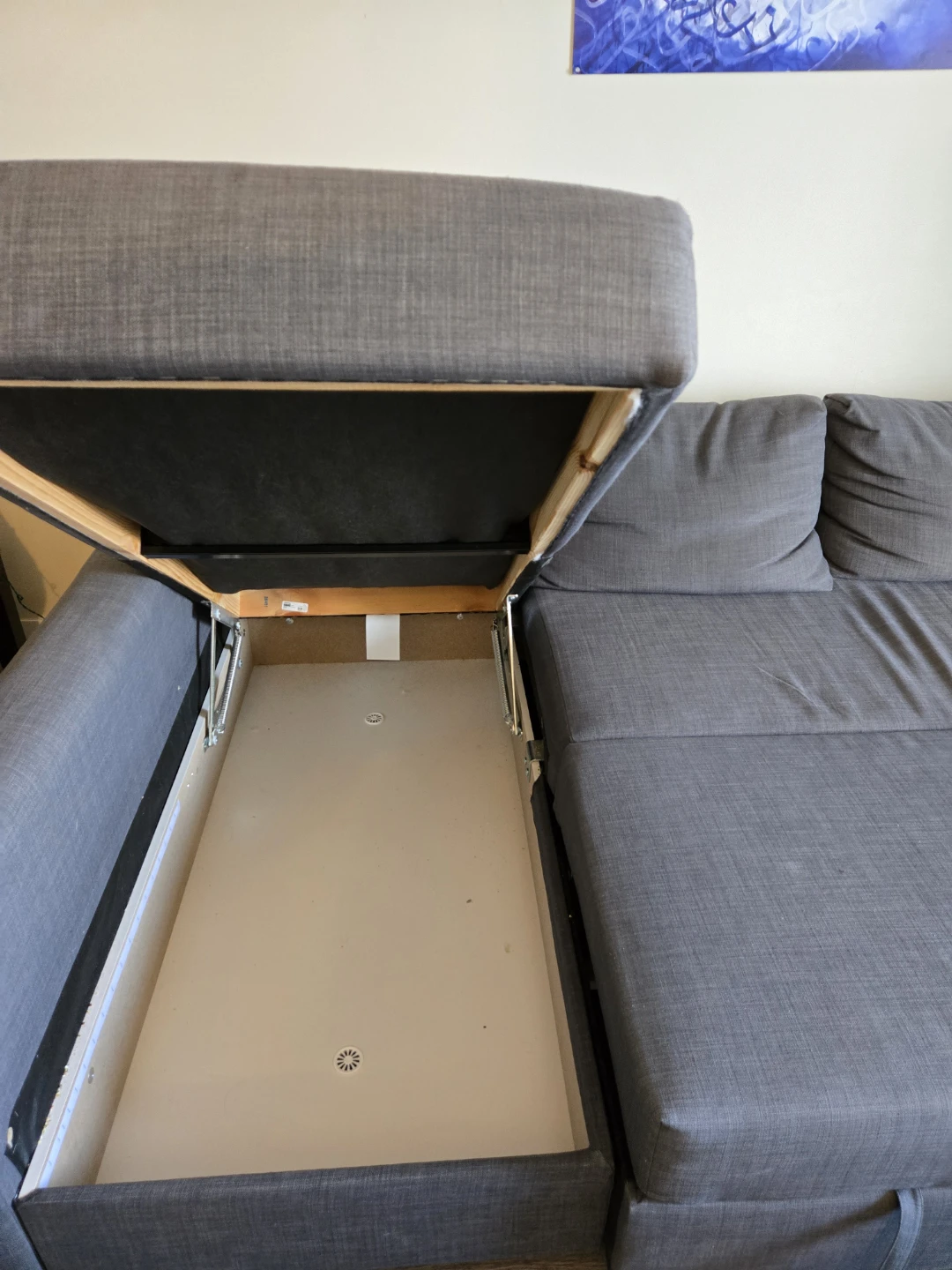 Selling a comfy grey sectional sofa! It's in great shape and has handy storage underneath the cushions. Perfect for a living room or den, and great for maximizing space
