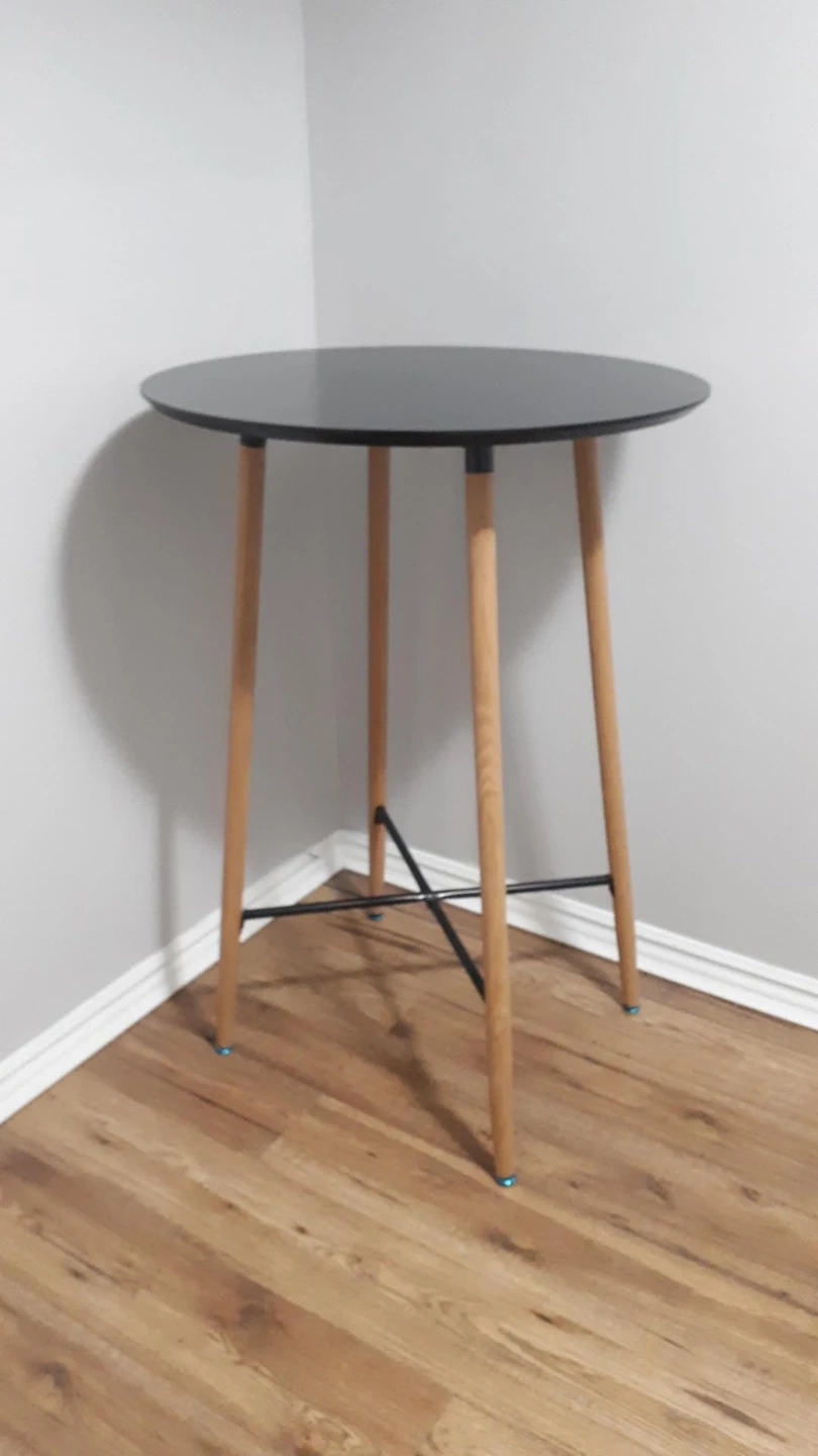 Selling a bar table with a black round top and wooden legs. It's in great shape and would be a stylish addition to any space